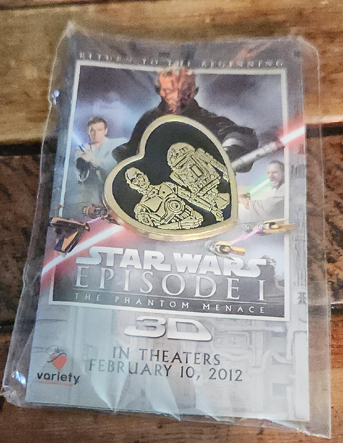 71Selling a Star Wars Episode I pin from The Phantom Menace. It features a heart shape with characters and the movie title on the promotional poster. A cool collectible for any Star Wars fan!