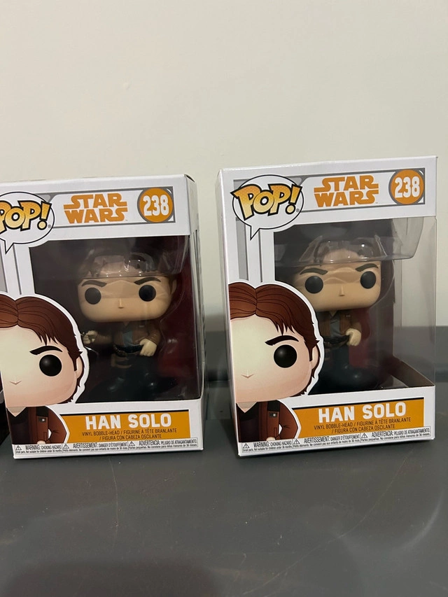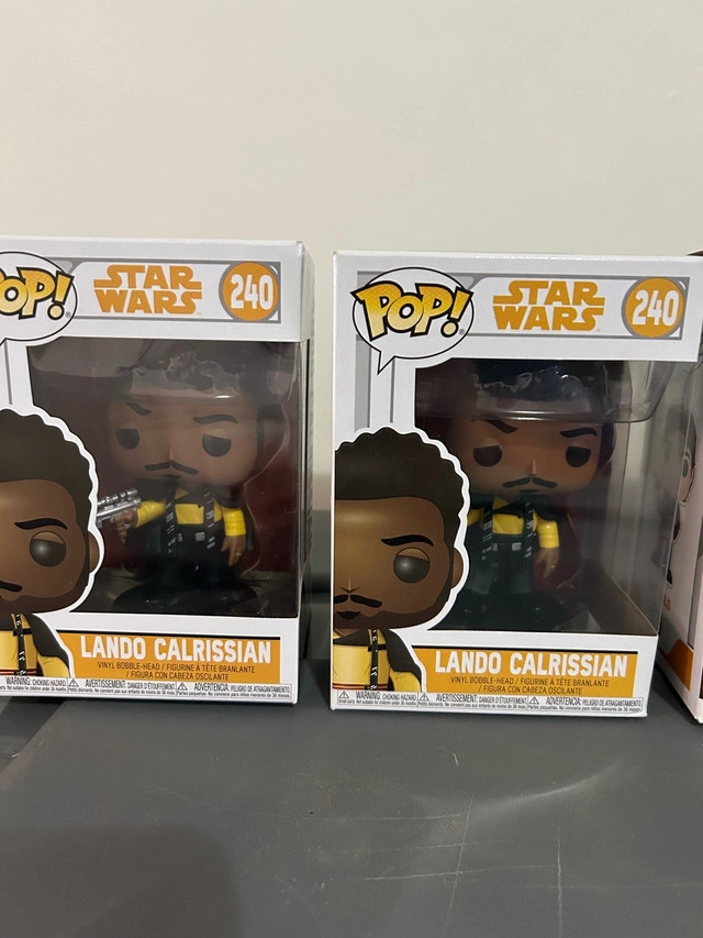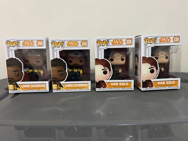 156I'm offering a set of Star Wars Funko Pop figures, specifically Lando Calrissian (number 240) and Han Solo (number 238), all in new condition. These figures are perfect for collectors or Star Wars fans looking to add to their collection. Each figure comes in its original packaging. * Character: Lando Calrissian & Han Solo * Series: Star Wars * Funko Pop! Numbers: 240, 238 * Condition: New Lando Calrissian - $15 each Han Solo - $20 each Sold separately or as a lot
