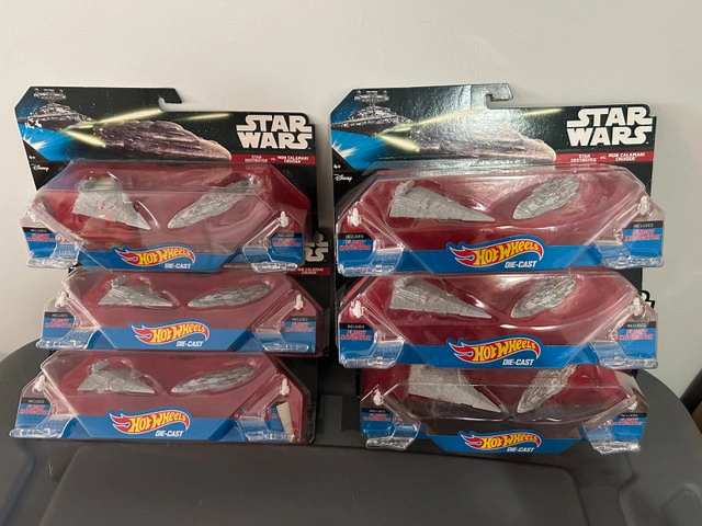 1566 available - $25 each, sold separately or as a lot. These Star Wars Hot Wheels sets feature a die-cast Star Destroyer and Mon Calamari Cruiser, perfect for collectors and fans alike. They are new in packaging and include a flight navigator accessory. Die-cast metal, officially licensed Star Wars product.