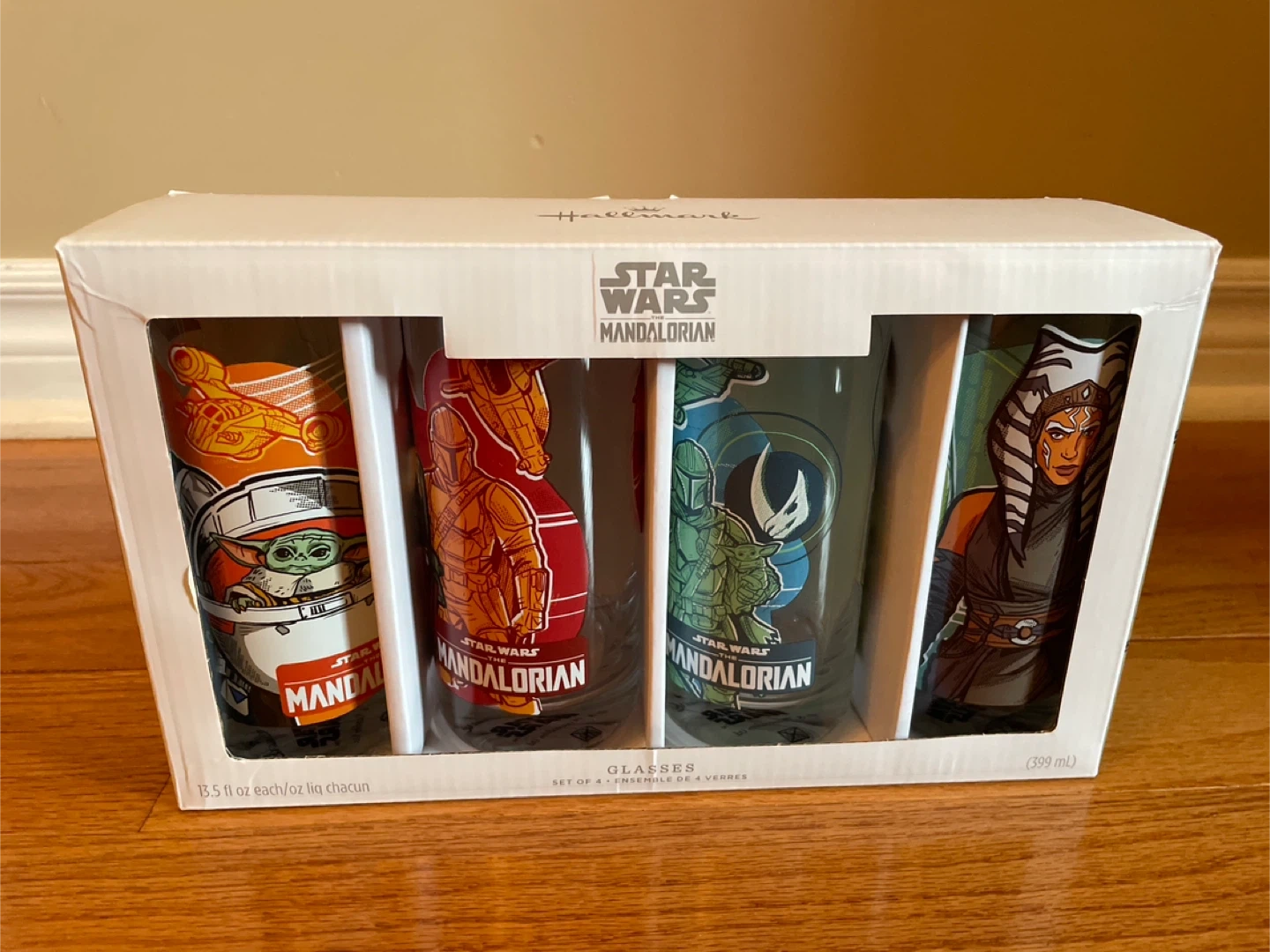 Selling a set of 4 Star Wars Mandalorian glasses from Hallmark. Each glass is 13.5 fl oz. The set features iconic characters from the Mandalorian series. Perfect for any Star Wars fan! New box, in perfect condition. Could be a gift. Retails for $49 plus tax.