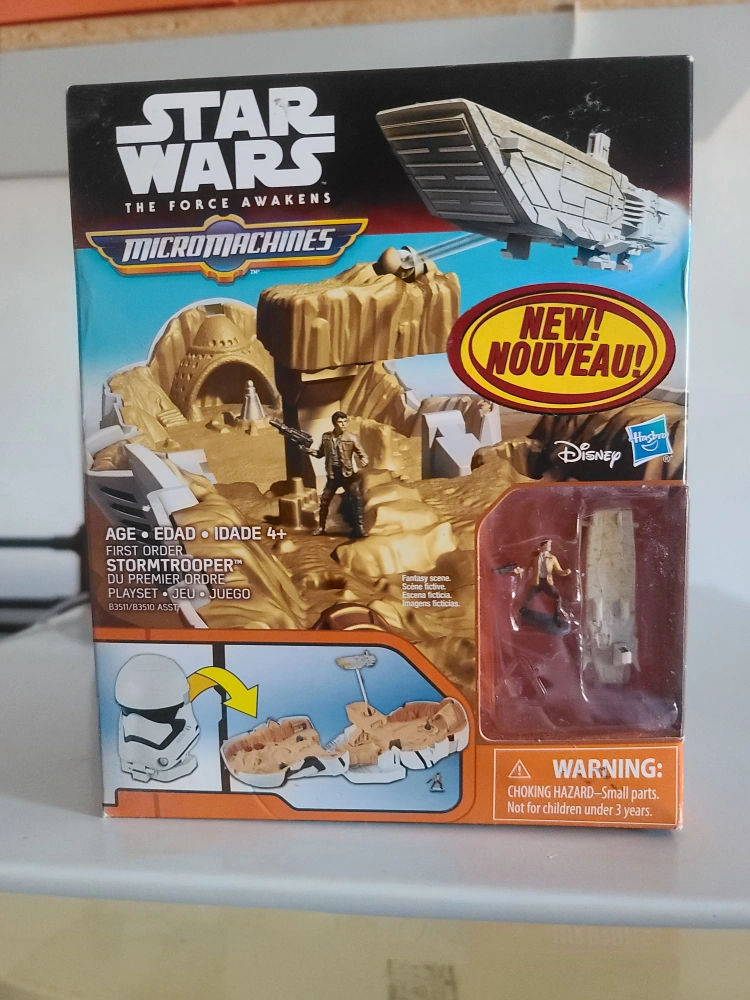 Selling a brand new Star Wars The Force Awakens Micro Machines First Order Stormtrooper playset! It includes the First Order Transporter and a Poe Dameron microfigure. Recommended for ages 4+