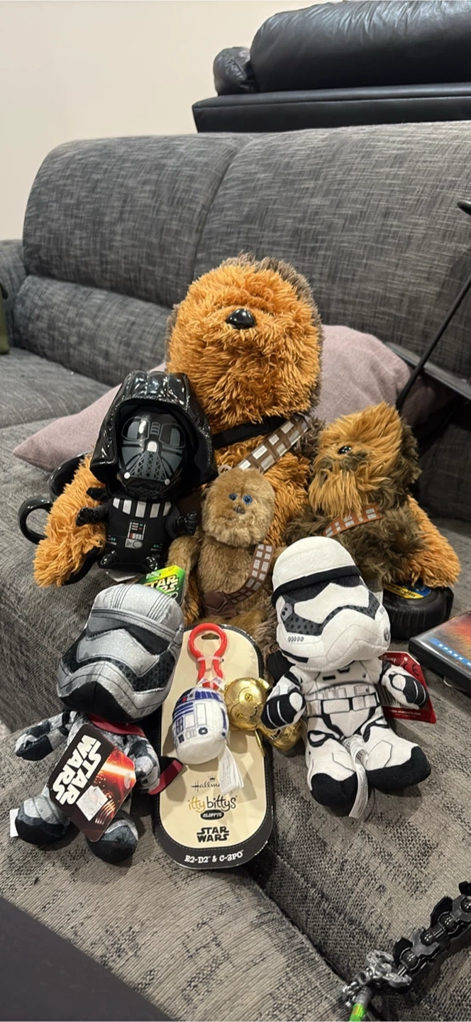 10Selling a collection of Star Wars Hallmark Itty Bittys plushies! Includes characters like Chewbacca, Darth Vader, and Stormtroopers, plus a cute R2-D2 & C-3PO keychain. Perfect for any Star Wars fan!