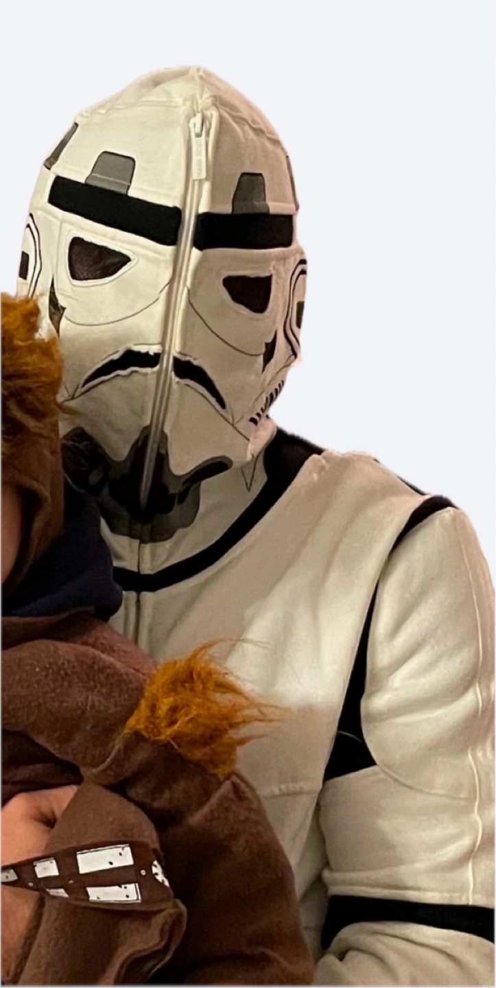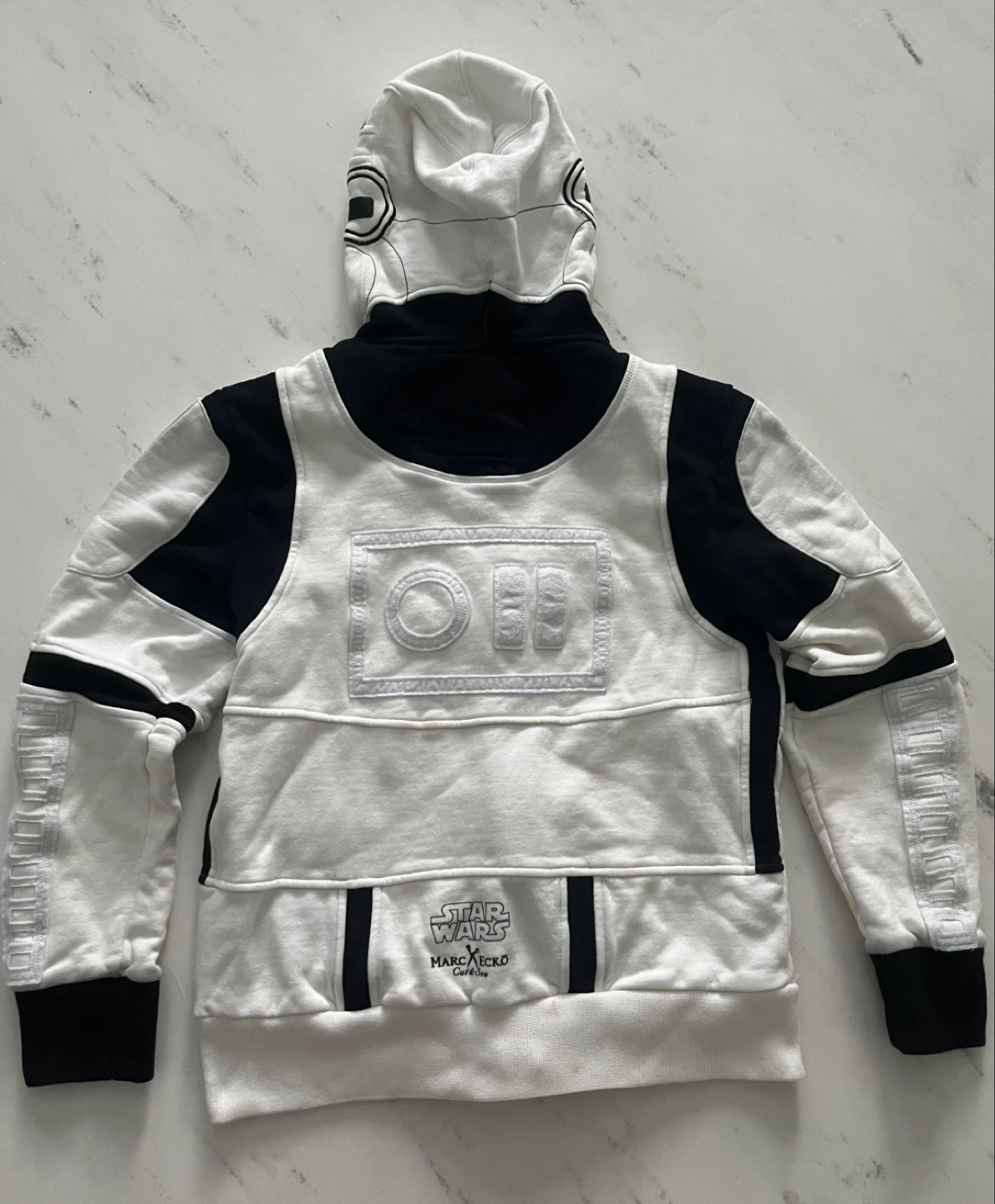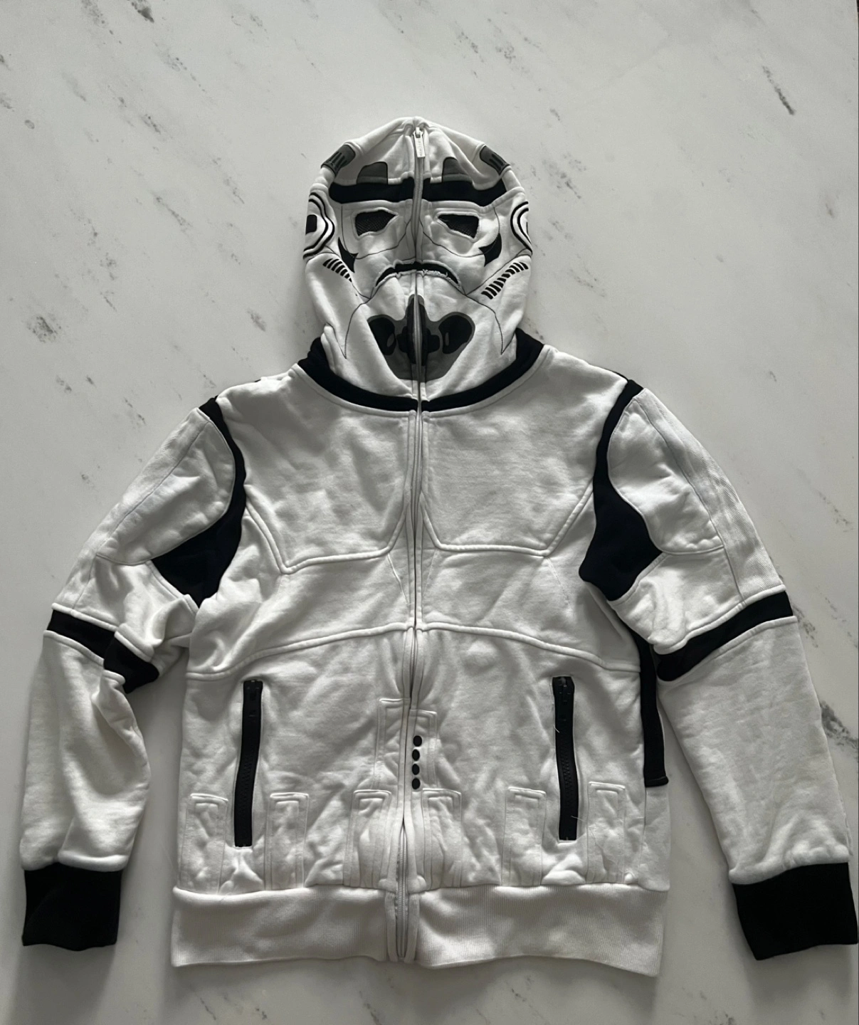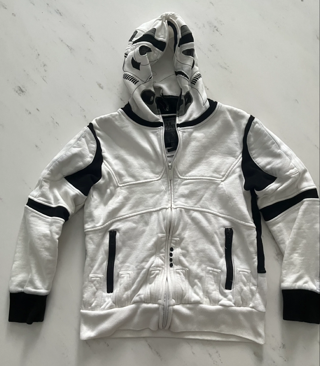 150Star Wars Storm Trooper Hoodie. Unique design where hood can be fully zipped up to make storm trooper helmet. Mesh cut out for eyes when fully zipped. Can also be worn as regular hoodie. Brand: Marc Ecko - Cut & Sew