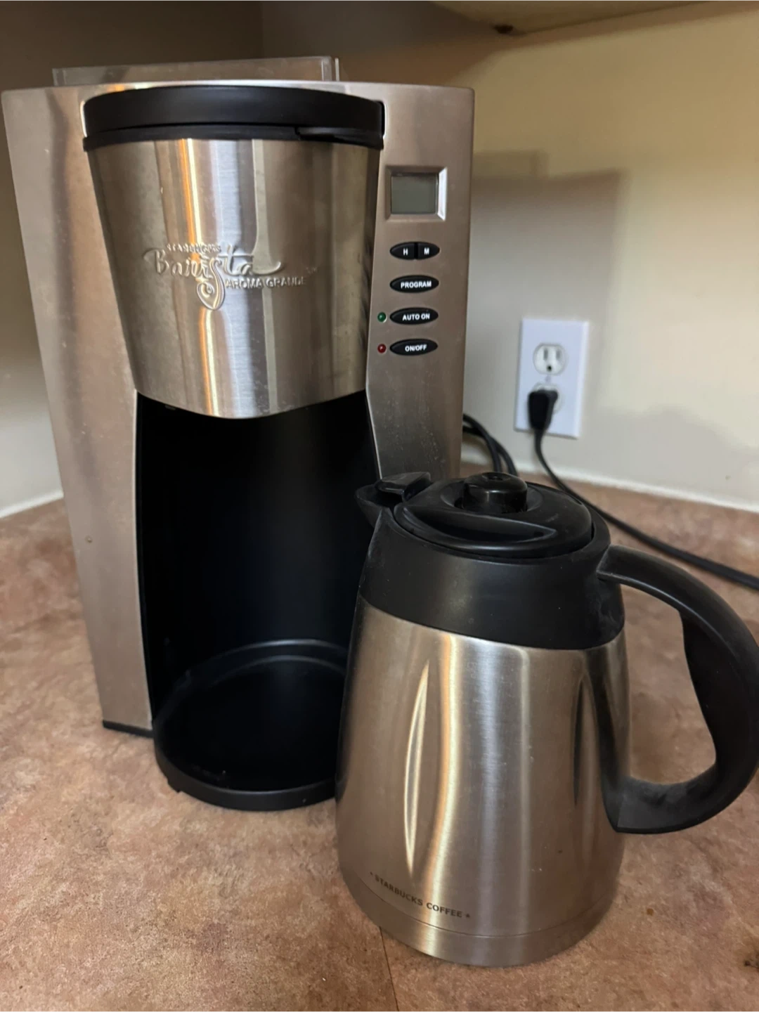 Selling a Starbucks Barista Aroma Grande coffee maker. It's in good condition and ready to brew your favourite coffee. It has a programmable function, auto on/off, and comes with a thermal carafe to keep your coffee hot longer. Perfect for any coffee lover!