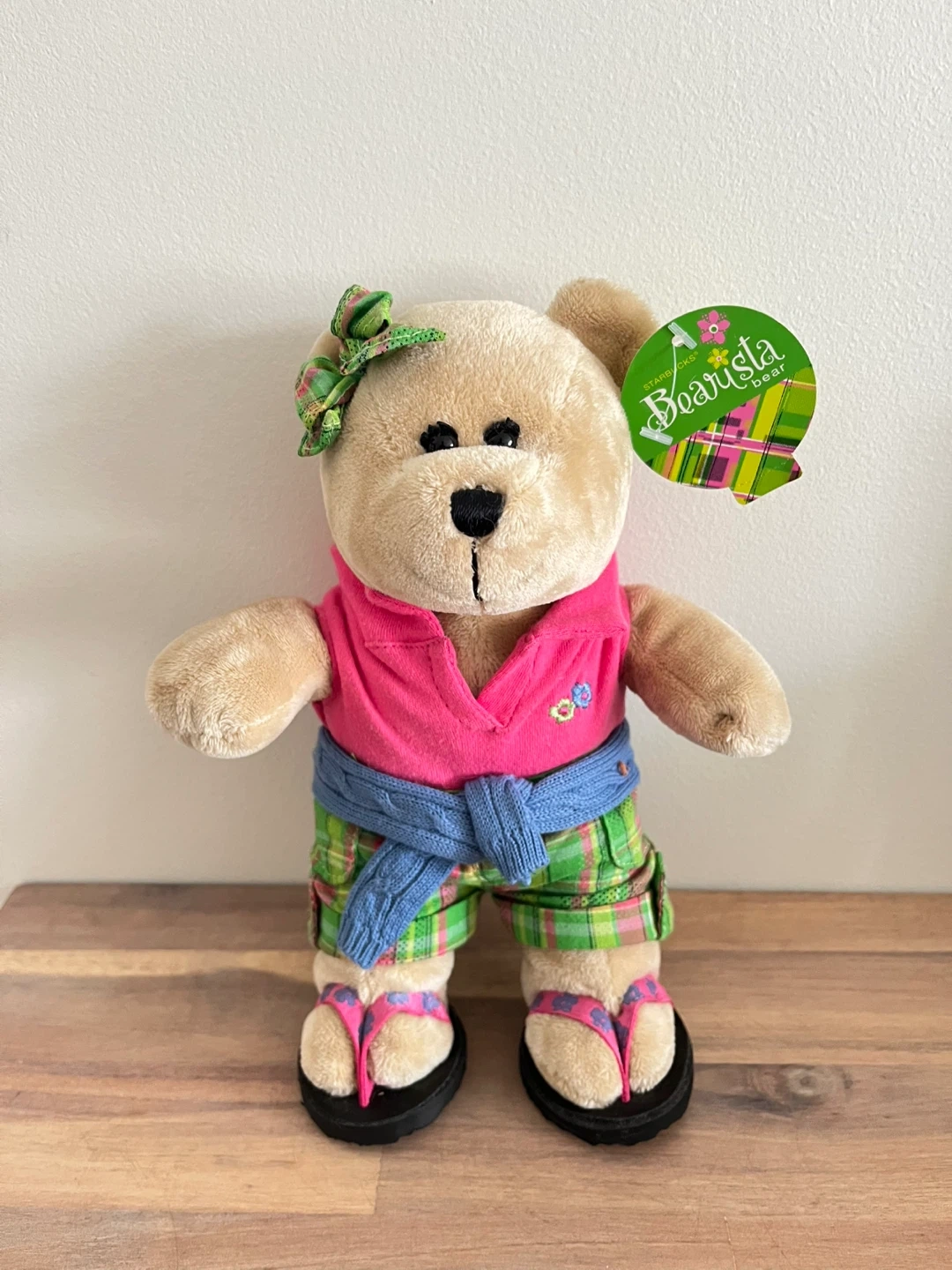 96Starbucks Coffee Bearista Bear from the 62nd Edition Collection! From 2007 New with tags. Perfect condition. Hawaiian/Summer theme, with a pink top, plaid shorts, and sandals.