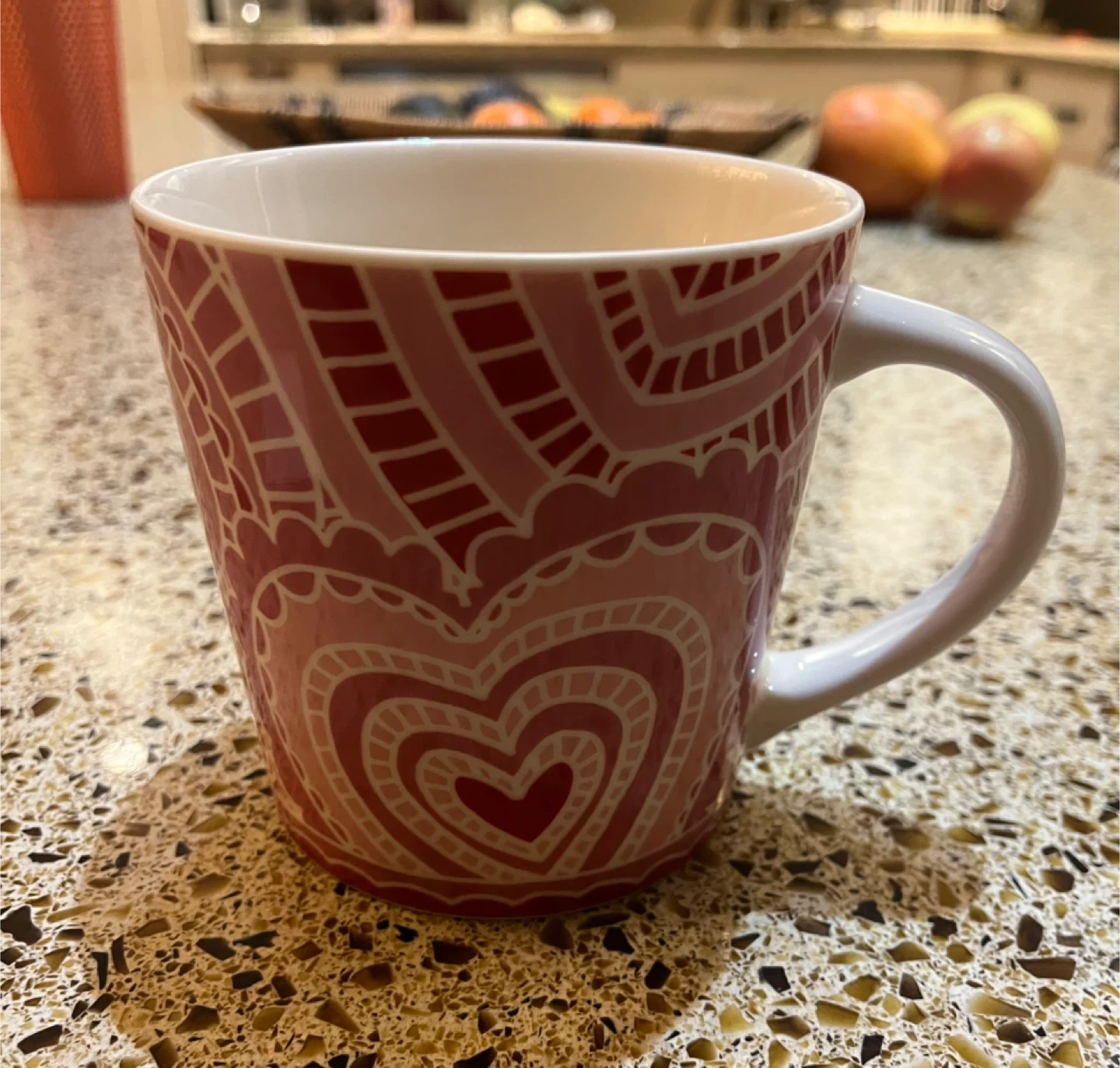 Cute Starbucks coffee mug with a heart design in shades of pink and red. Microwave and dishwasher safe. Perfect for your morning coffee or tea!