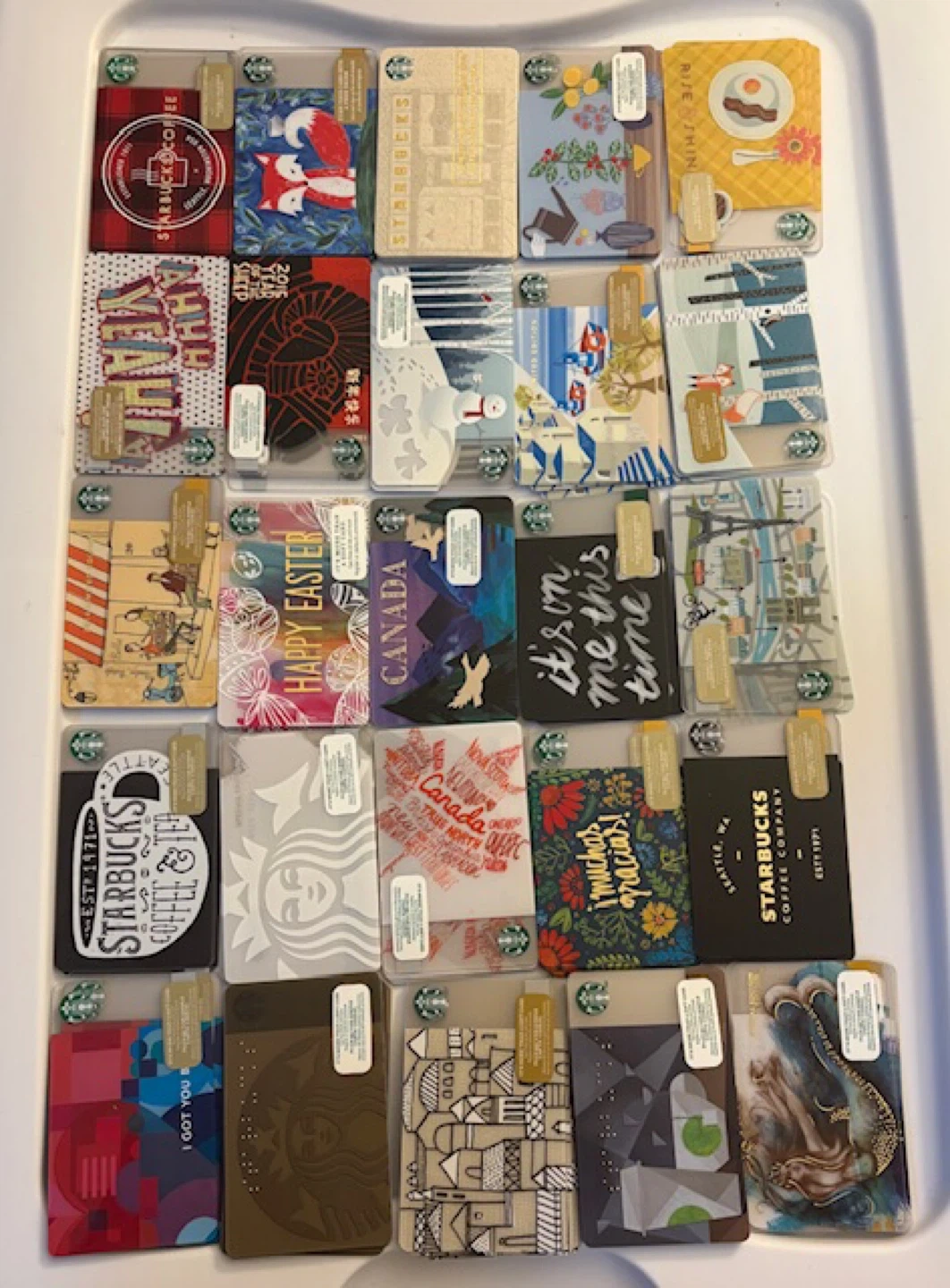 186Selling a variety of Starbucks giftcards with different designs! Great for collectors! 🤩 100 cards, 25 different designs, four of each design, cards have a zero balance
