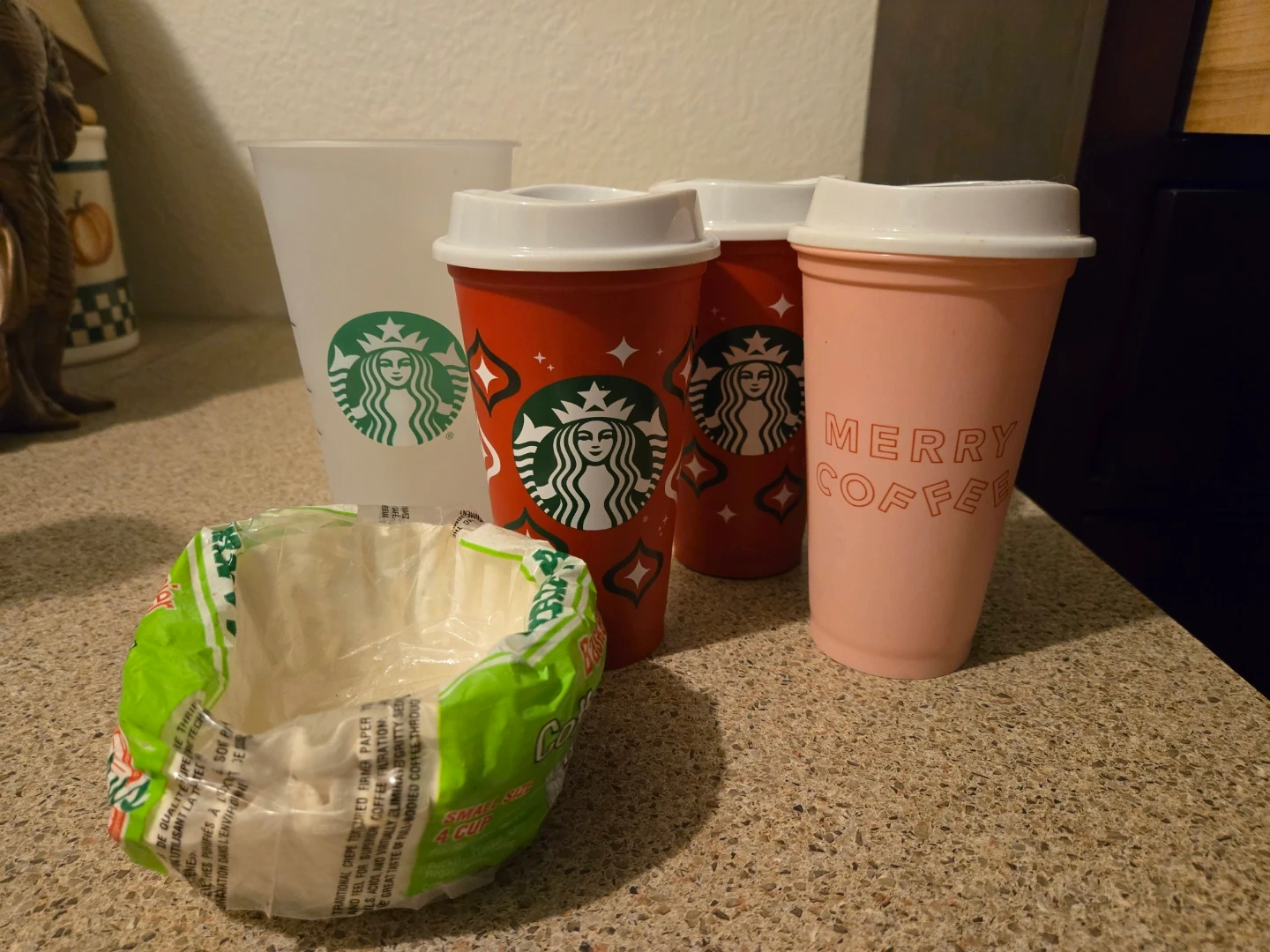 56Selling a few Starbucks holiday cups! They're great for adding a festive touch to your coffee routine. One is a light pink with 'Merry Coffee' written on it, and the others are red with the classic Starbucks logo and holiday designs