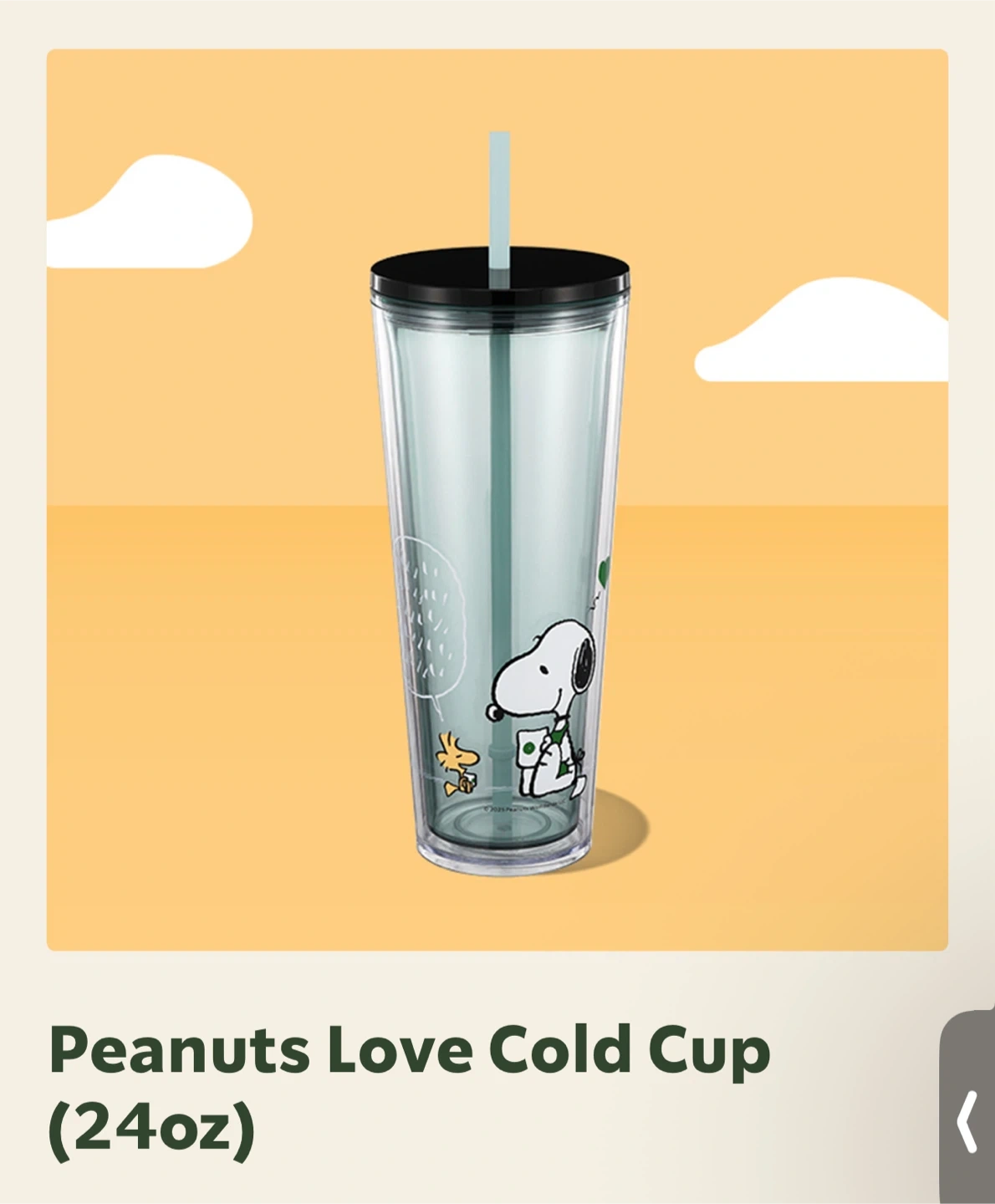 10Selling a Starbucks Peanuts Love Cold Cup. This is a 24oz cup featuring Snoopy and Woodstock! Perfect for your drinks on the go.