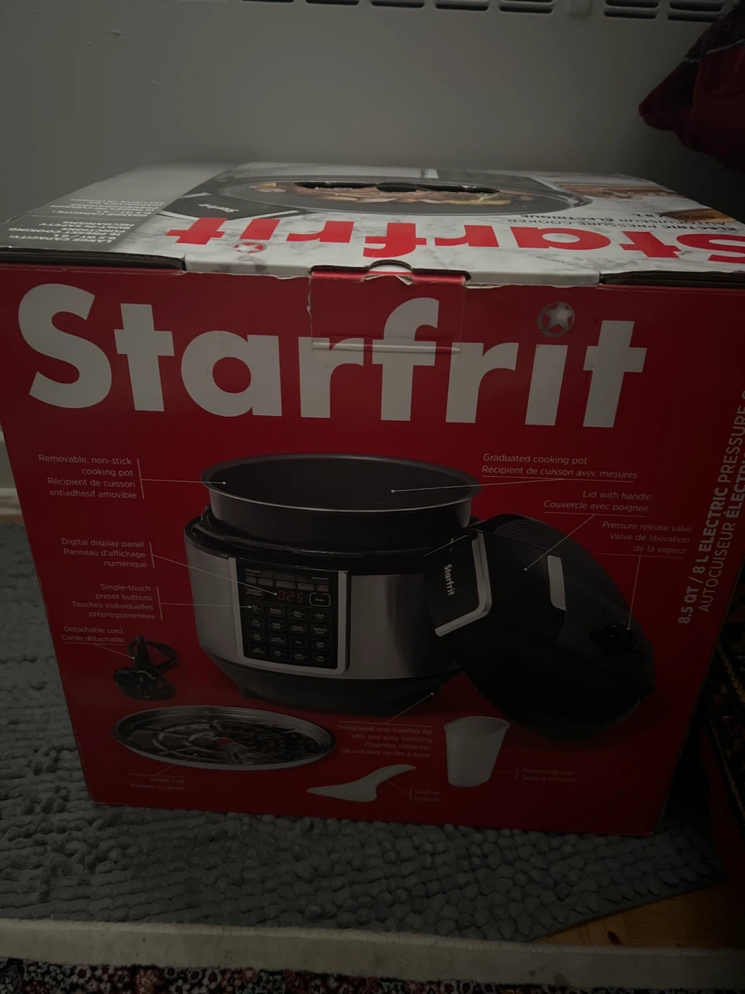 Selling a brand new Starfrit Electric Pressure Cooker! It's still in its original packaging and has never been used. This model has an 8.5 quart (8 L) capacity, perfect for family meals. It features a digital display panel, removable non-stick cooking pot, and a lid with a handle. Get yours today!
