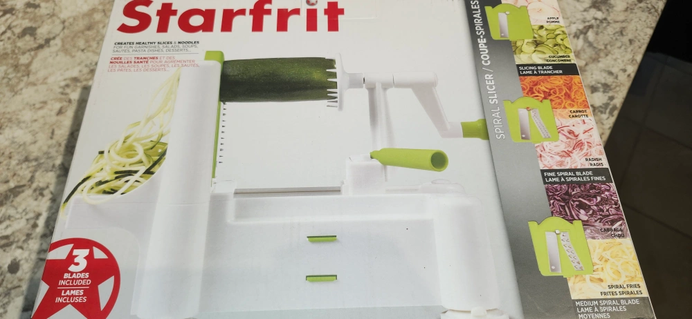60I'm selling a brand new Starfrit Spiral Slicer! It comes with 3 blades for slicing, fine spiral, and medium spiral cuts. It's still in its original packaging, so it's ready to create healthy slices and noodles for your meals!
