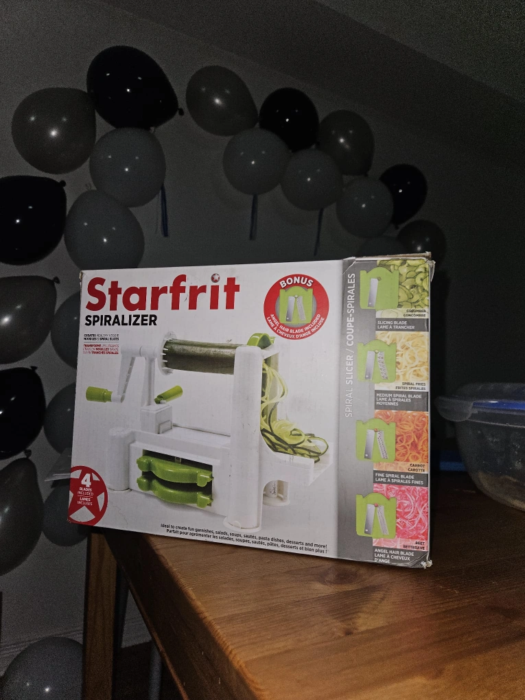 15Selling a Starfrit Spiralizer in excellent condition! It comes with 4 different blades for making garnishes, salads, soups, sauces, pasta dishes, desserts and more! It's perfect for creating fun spirals from veggies like zucchini, carrots, and cucumbers