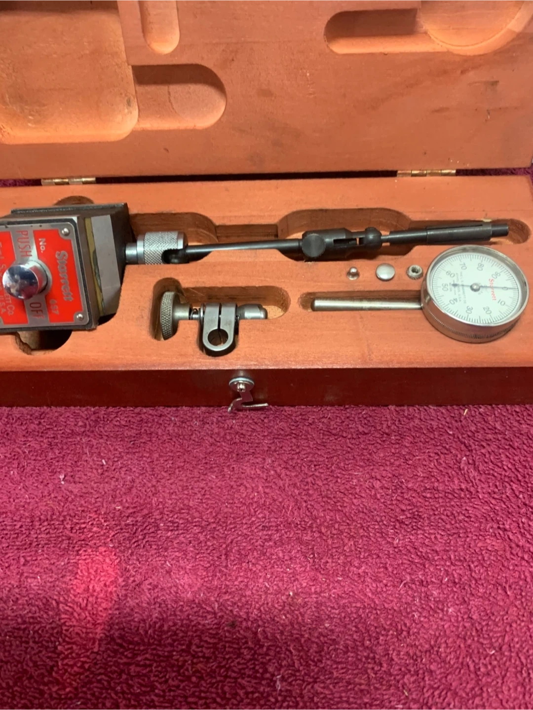 STARRETT magnetic base indicator holder, model 657CZ. With 196B indicator & 196K sleeve. Like new. Pickup in Bolton $275
