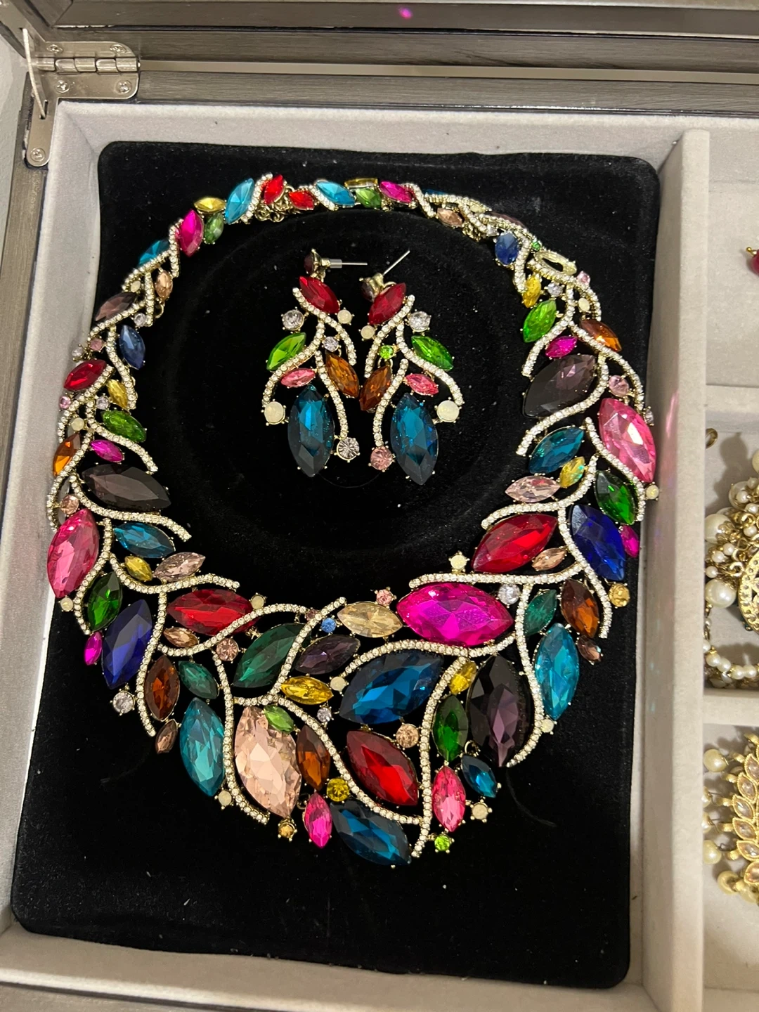 10Gorgeous and eye-catching necklace and earring set! This set features a variety of colourful stones that are sure to make a statement. Comes in its original box.