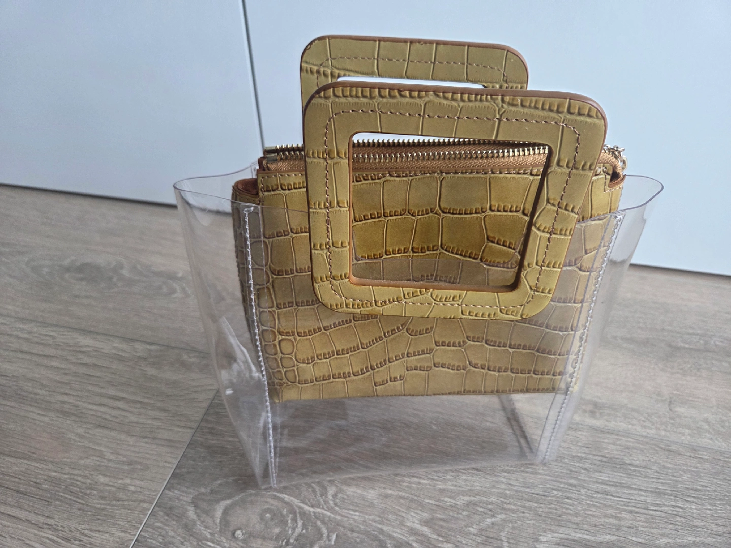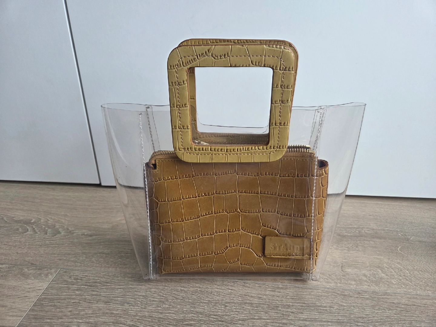 10Selling a STAUD clear tote bag! It's in great condition and perfect for adding a unique touch to your outfit. The bag features a distinctive crocodile-embossed leather pouch inside. It's a stylish and functional accessory!
