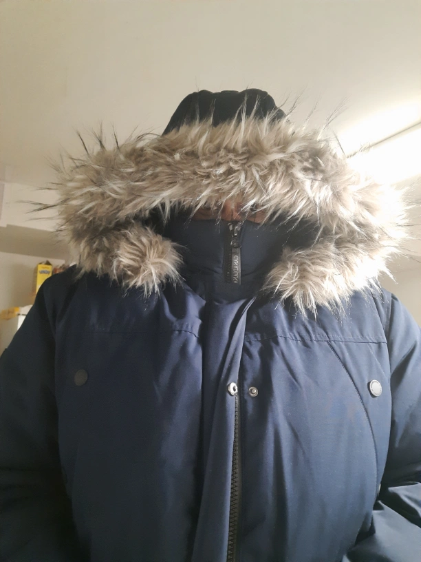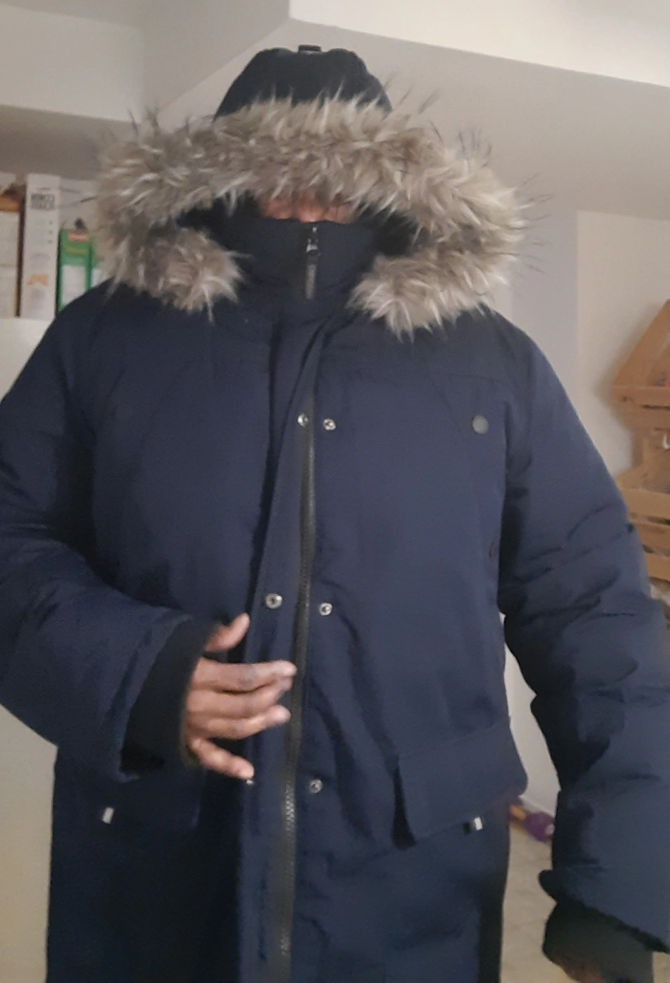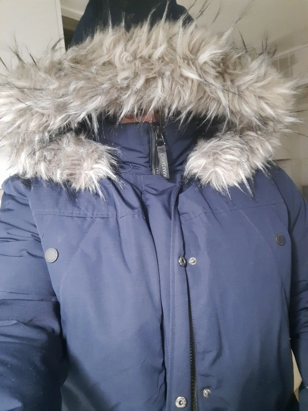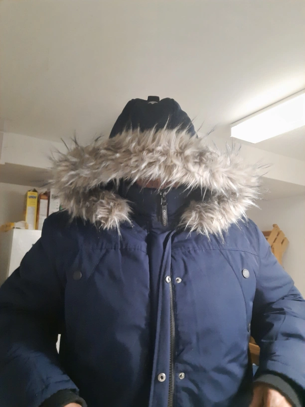 Men's winter jacket with a faux fur hood that can be adjusted. Blue in color. Worn for 1 month. It's very clean , extremely warm, and in excellent condition.