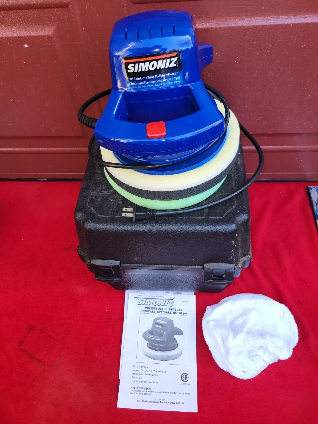 This Simoniz random orbit polisher/waxer comes with a 10-inch pad diameter and a handy carrying case. It includes ncludes multiple polishing pads and a microfiber bonnet in excellent working condition