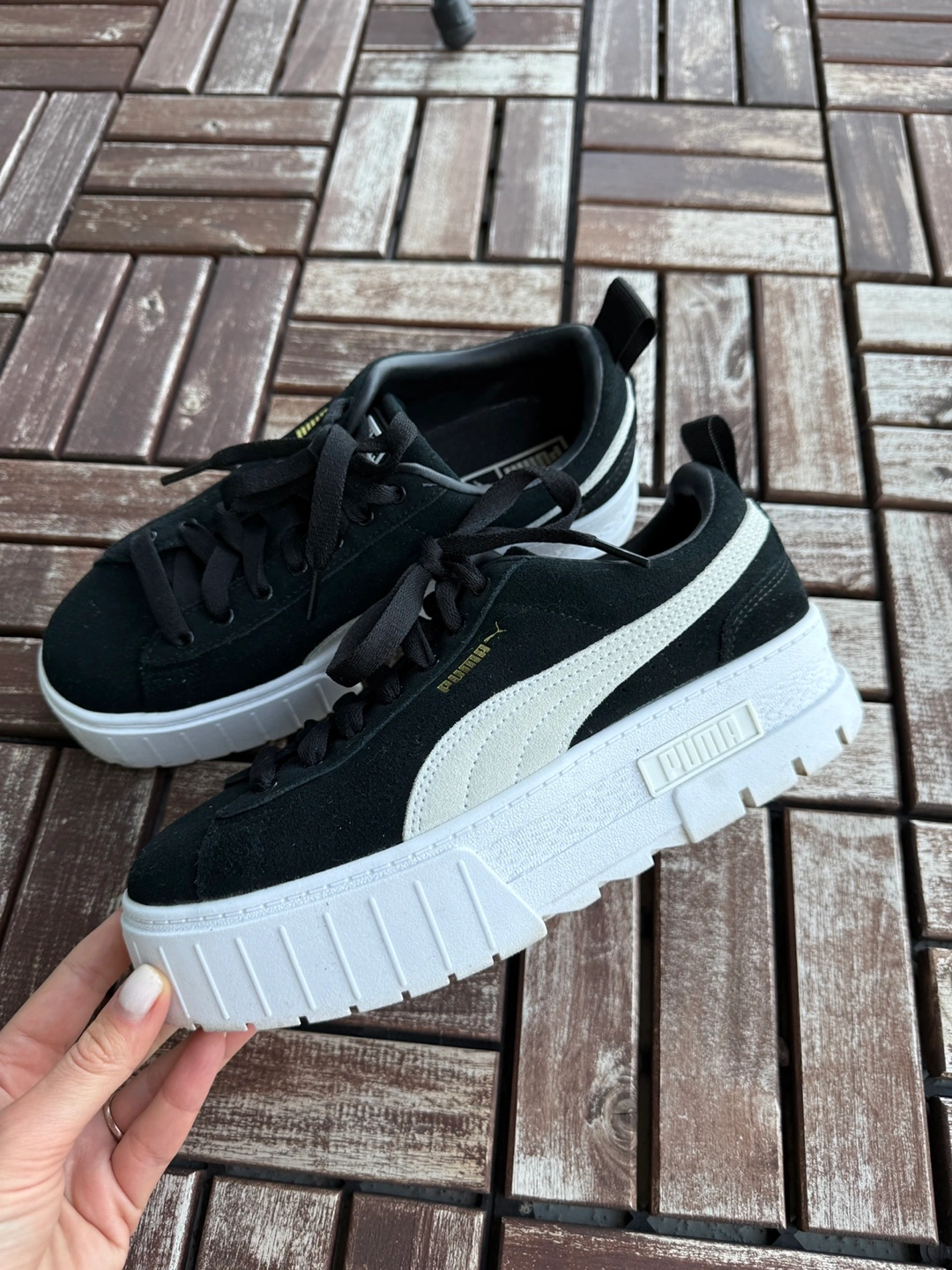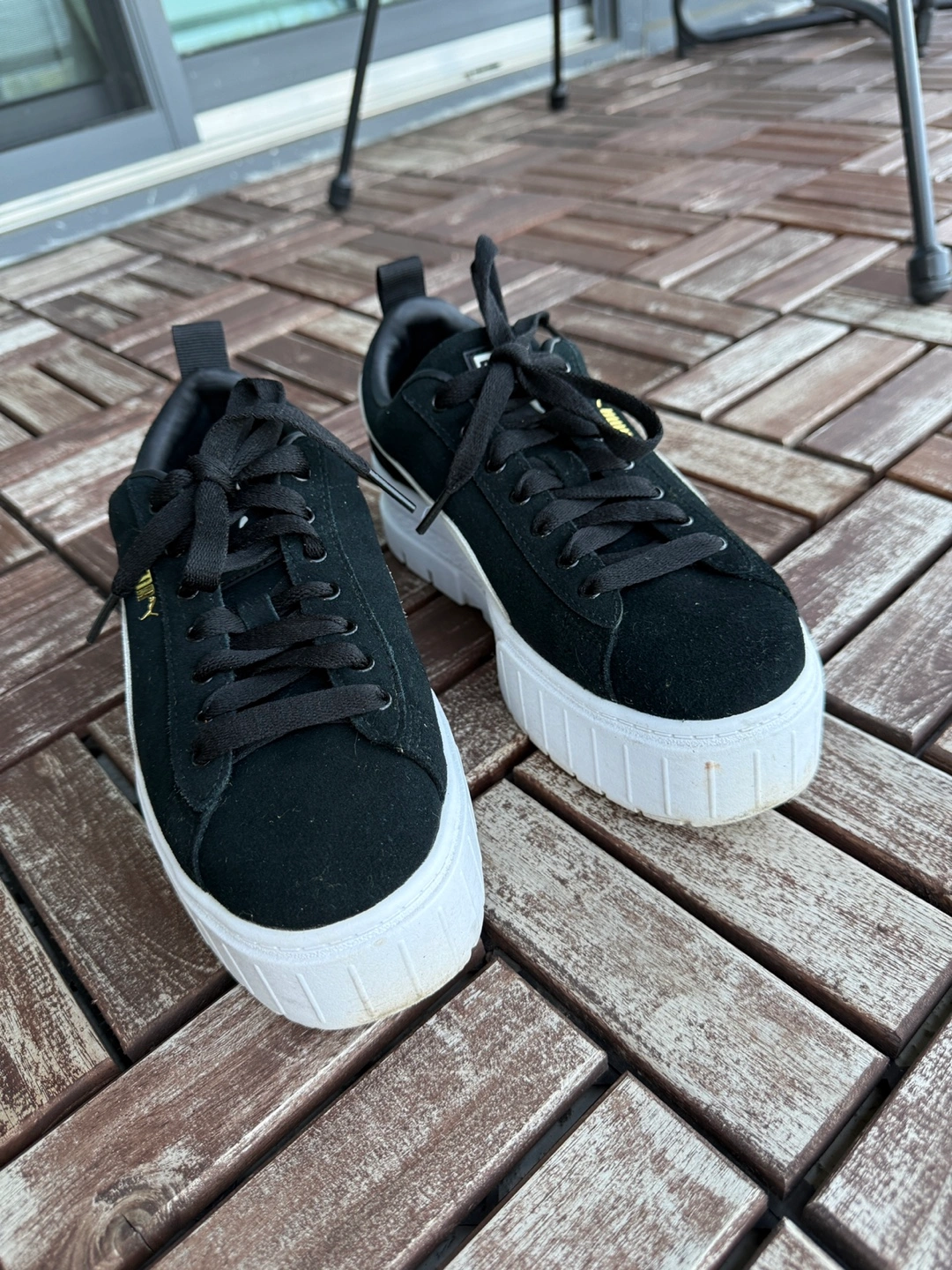 Selling a pair of Puma Mayze Stack sneakers in women's size 8! They're in great shape and ready for a new home. These stylish sneakers feature a black and white design with a chunky platform sole. Perfect for adding a bit of height and style to your everyday look
