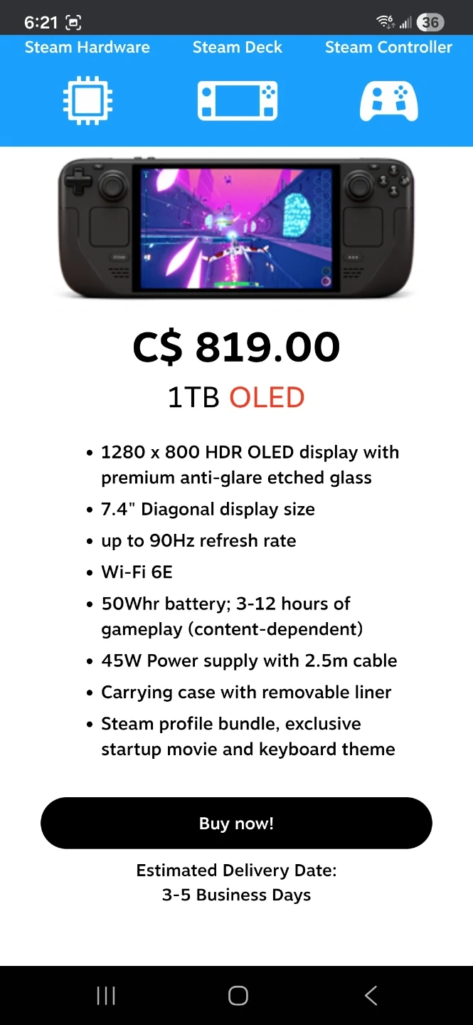 60Selling a Steam Deck with a 1TB OLED screen! It features: - 1280 x 800 HDR display with premium anti-glare etched glass - 7.4" Diagonal display size - Up to 90Hz refresh rate - Wi-Fi 6E - 50Whr battery; 3-12 hours of gameplay - 45W Power supply with 2.5m cable - Carrying case with removable liner - Steam profile bundle Also included is a 9-in-1 Steam Deck Docking Station.