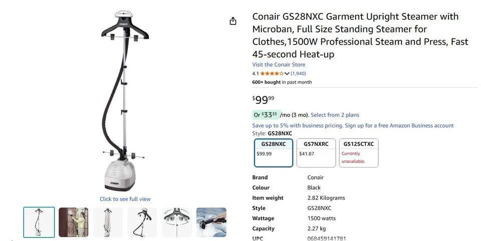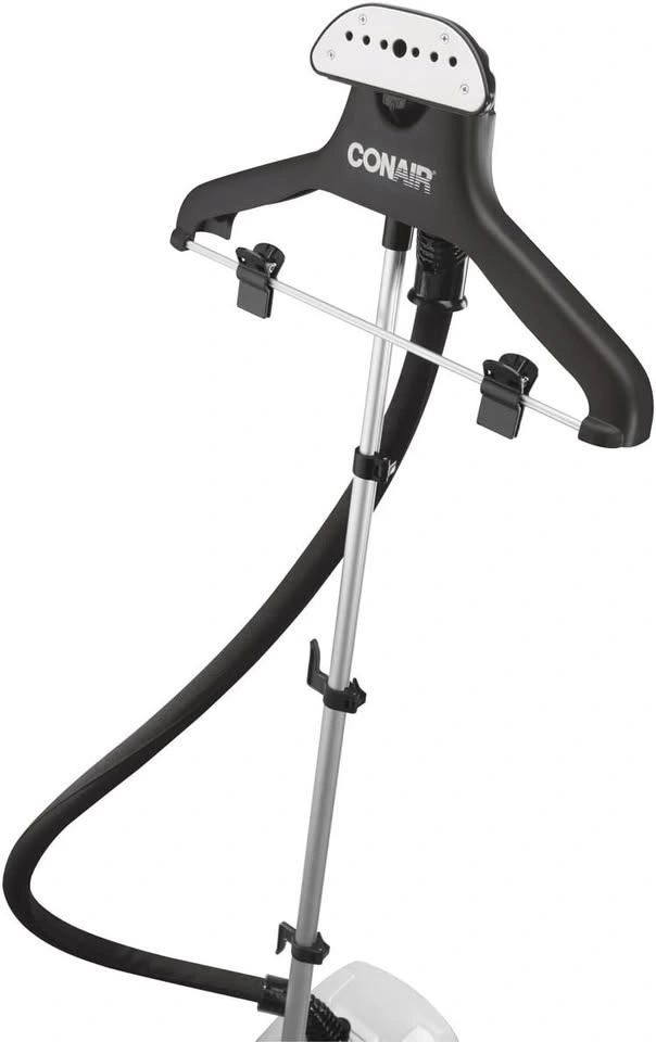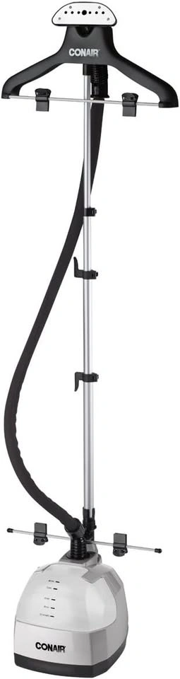 67Full Size Standing Steamer for Clothes. 1500W Professional Steam and Press, Fast 45-second Heat-up. Features a telescoping pole for height adjustment and T nozzle with 5 foot cool touch insulated hose, 360 degree rotating hanger with clips for steaming pants, and easy roll casters. MODEL: GS28NXC