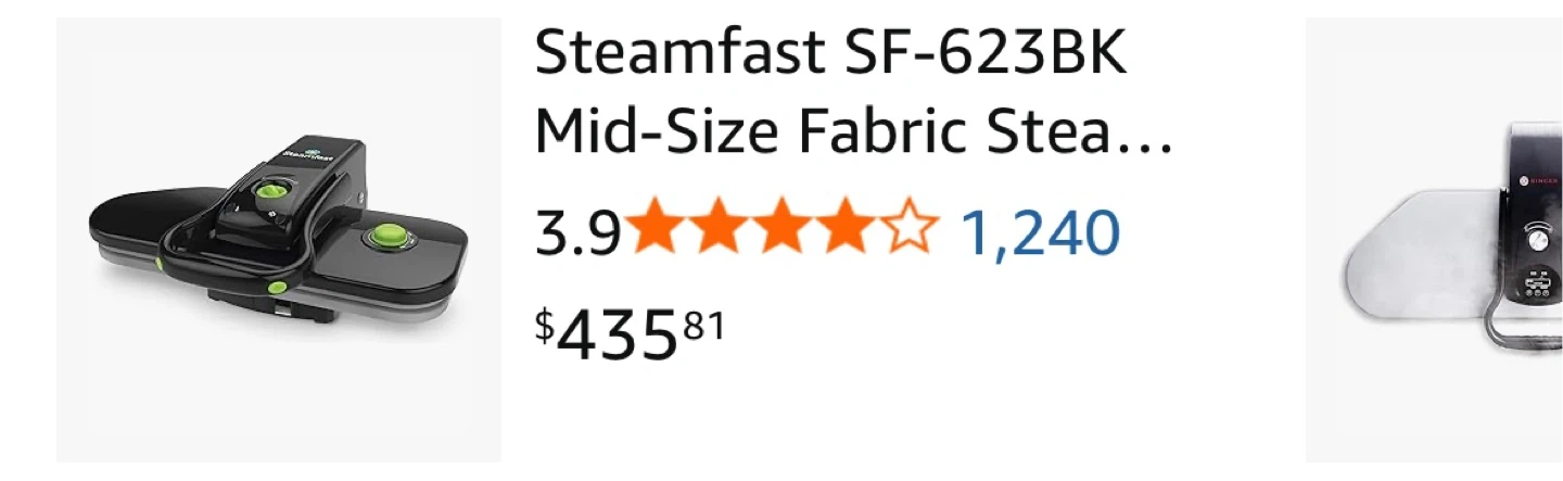 621This is a Steamfast SF-680 digital fabric steam press in very good working condition, perfect for achieving professional-quality results at home. This model features a digital control panel for easy operation and precise temperature settings for various fabric types. Additional features include: * Large pressing surface * Digital controls with multiple fabric settings * Automatic shut-off for safety * Locking handle for portability and storage * Includes all original accessories $95 Yonge and finch area