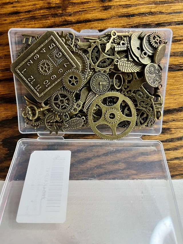 137I have a delightful assortment of steampunk charms for sale, perfect for adding a touch of vintage-industrial flair to your crafts! These charms are in new condition and come in a variety of shapes and sizes, including gears, wings, keys, and more, all with an antique bronze finish. Here are some of the charm types included: * Gears and cogs * Wings * Keys * Clock faces * Skulls Unleash your creativity and let these charms transport your projects to a bygone era of steam-powered innovation! Check out my other listings for more cool stuff!