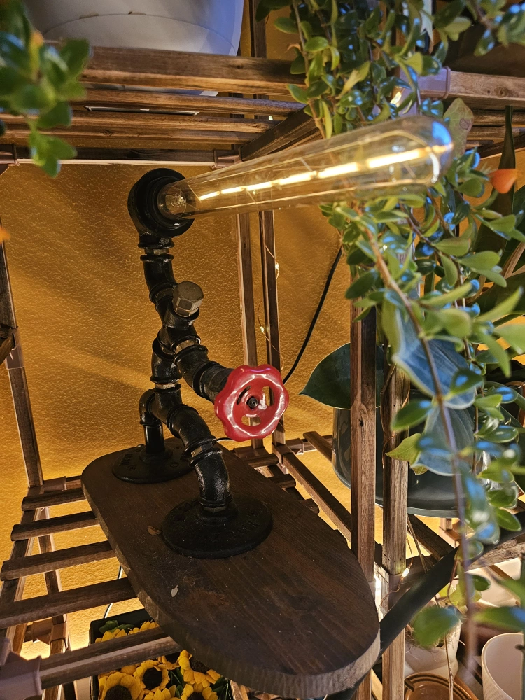 This is a unique steampunk-style table lamp. It features a pipe man design with a red valve accent. The lamp has a wooden base and gives off a warm, industrial vibe! Originally sold for $537.33, it's a statement piece that will add character to any room