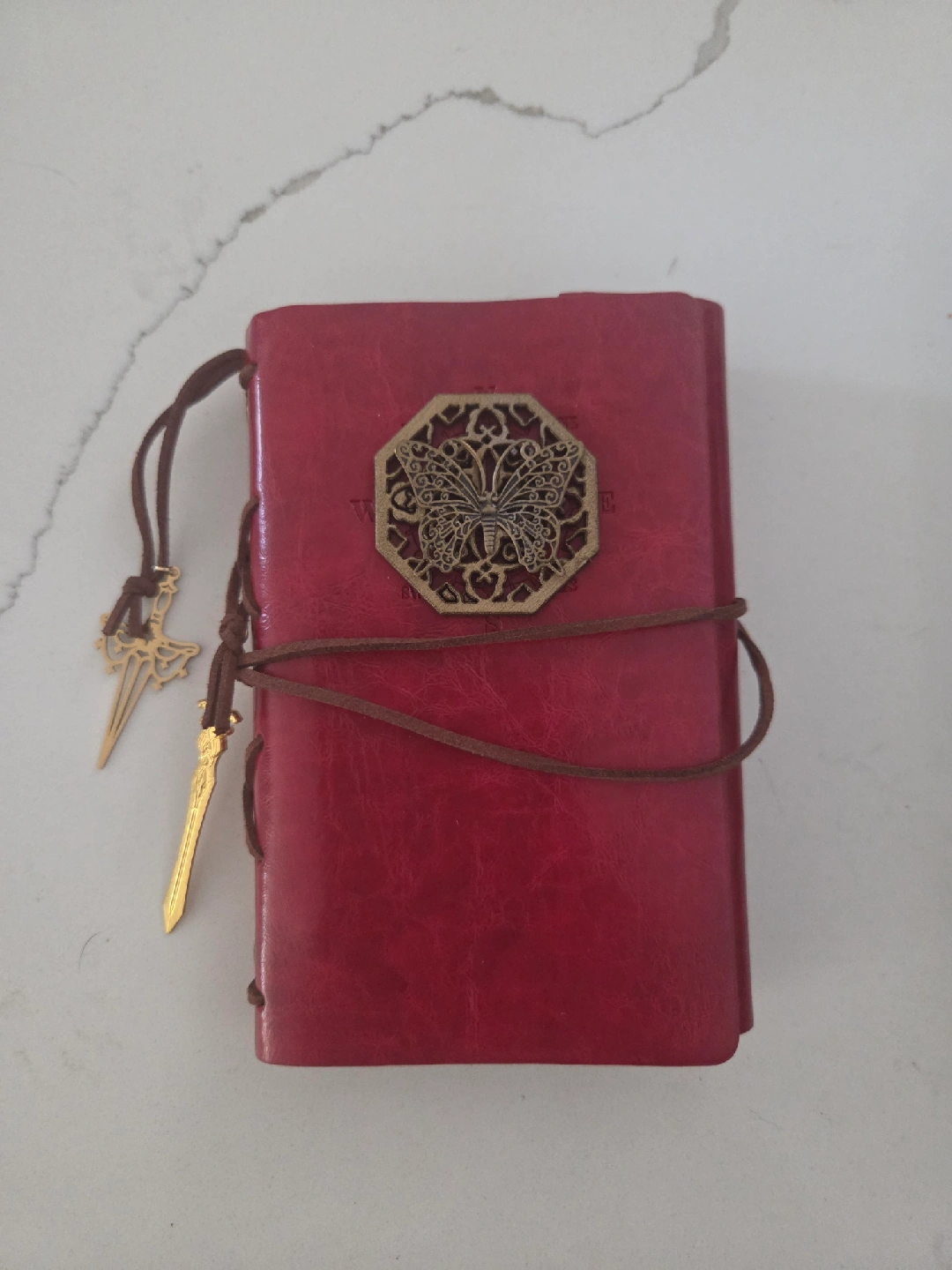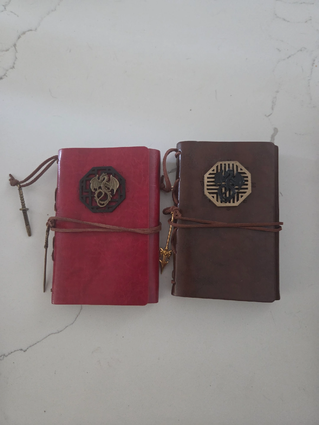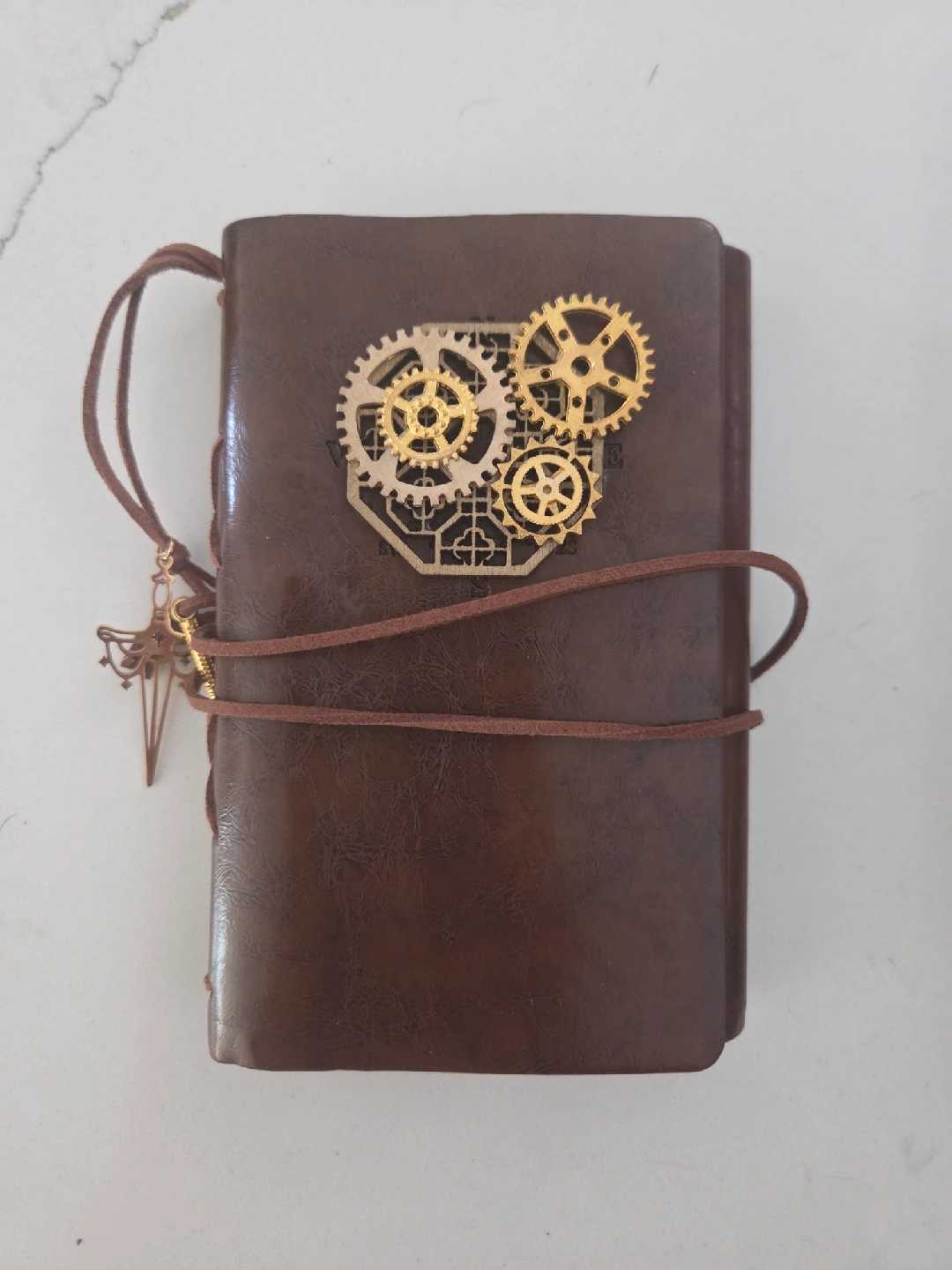 I'm selling these steampunk leather journals. They each have a unique design and charm. Perfect for writing, sketching, or as a personal diary. They come in red, brown, and black.