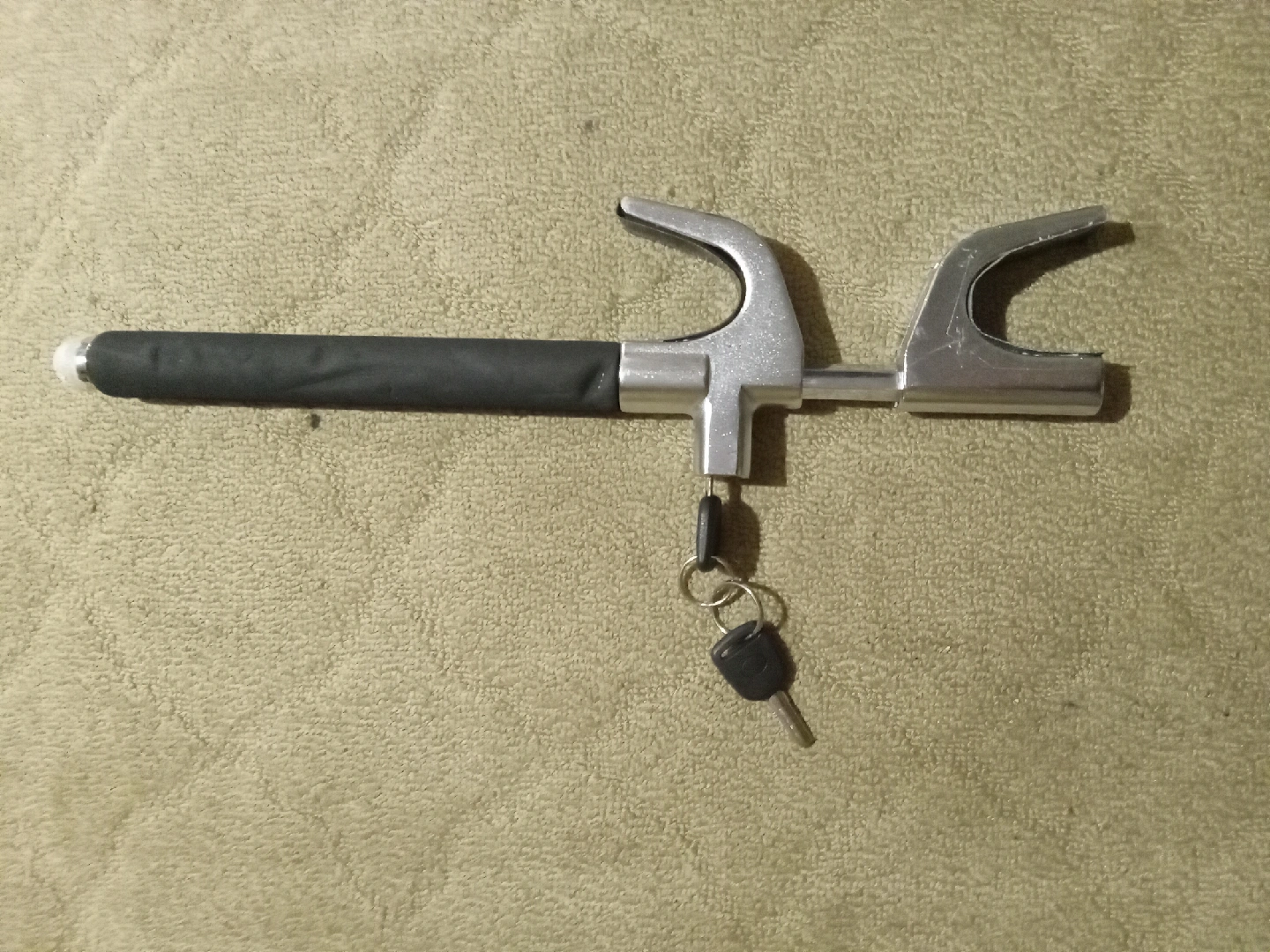 Selling a steering wheel lock, complete with its key. It's in great shape and ready to keep your vehicle secure!