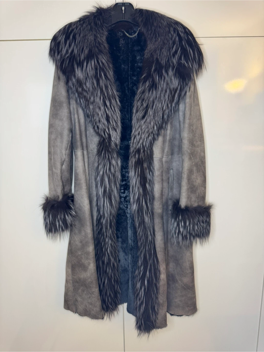 155This is a beautiful Stefania Sarre shearling coat in a size 12. It features genuine leather and fur trim. It's in great condition and ready to keep you warm this winter!
