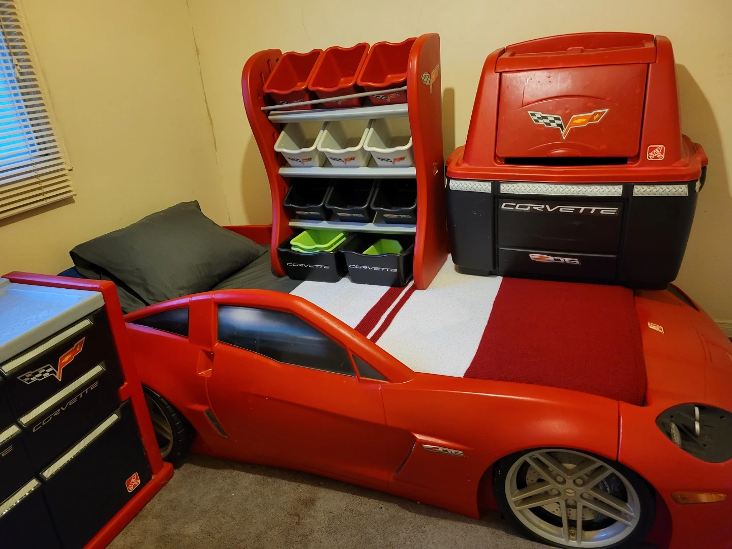 60This is a Step2 Corvette Z06 toddler to twin bed. It comes with the bed frame shaped like a Corvette, 2 storage units, and an organizer with bins. Perfect for a car-loving kiddo! 4 PIECES INCLUDED
