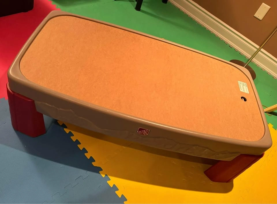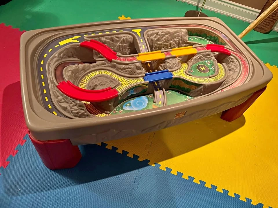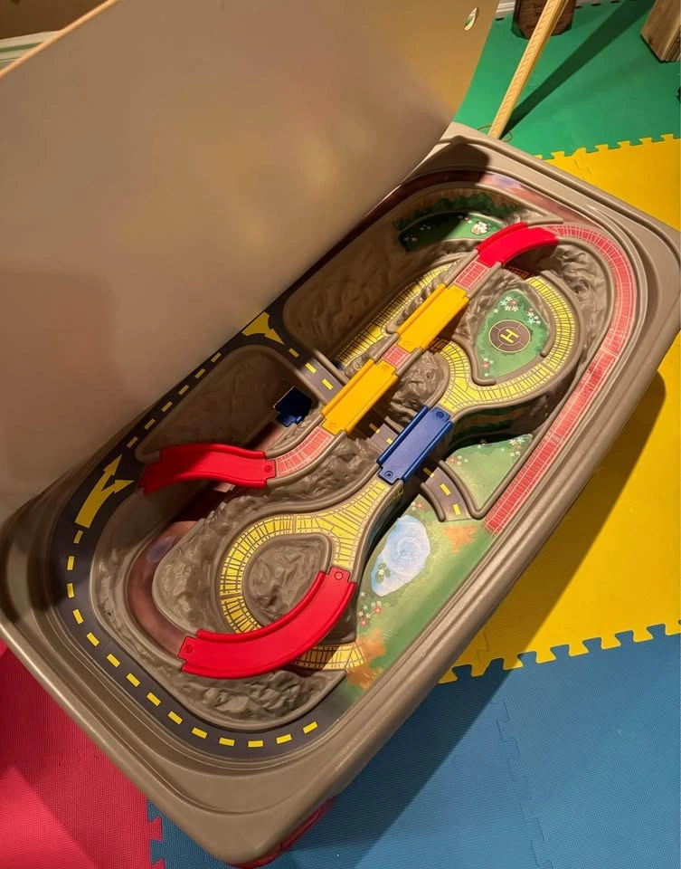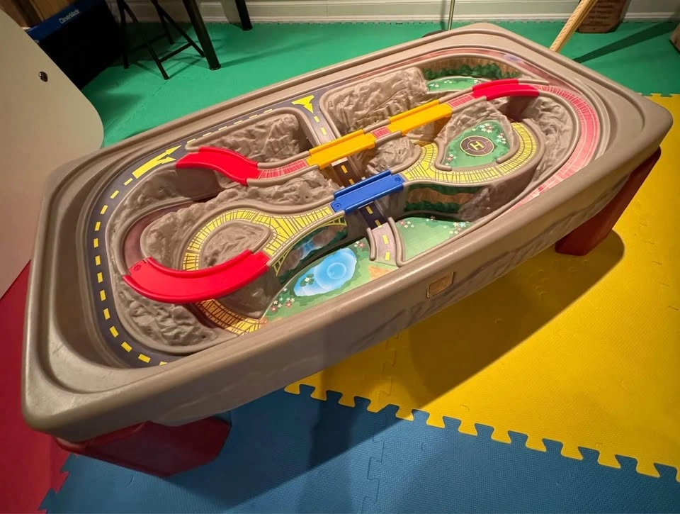This train table features a multi-level, molded-in track and non-removable bridges so that you will never have to reset your children’s track again! The smooth cover transforms it into a table to be used for crafts and/or snacks. It has a hardboard masonite cover (wood colour on one side white on opposite side). The last photo is from Step2 to help visualize the size. Toy cars/trains and art supplies are NOT included. Durable plastic build with colorful molded-in roadways, bridges, and a scenic layout. Table height allows children to stand and play comfortably Large enough for multiple kids to play together. Perfect for trains, cars, and imaginative play (trains and cars not included). Easy to clean and very sturdy — great for playrooms, basements, or daycare settings. Recommended Age: 3 + Years Dimensions (approx): 47” L x 26” W x 16” H. Weight: 10.9 kg