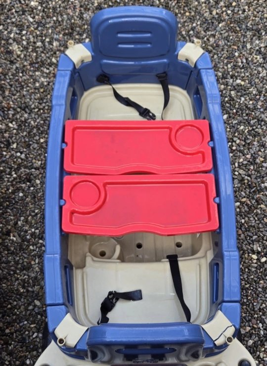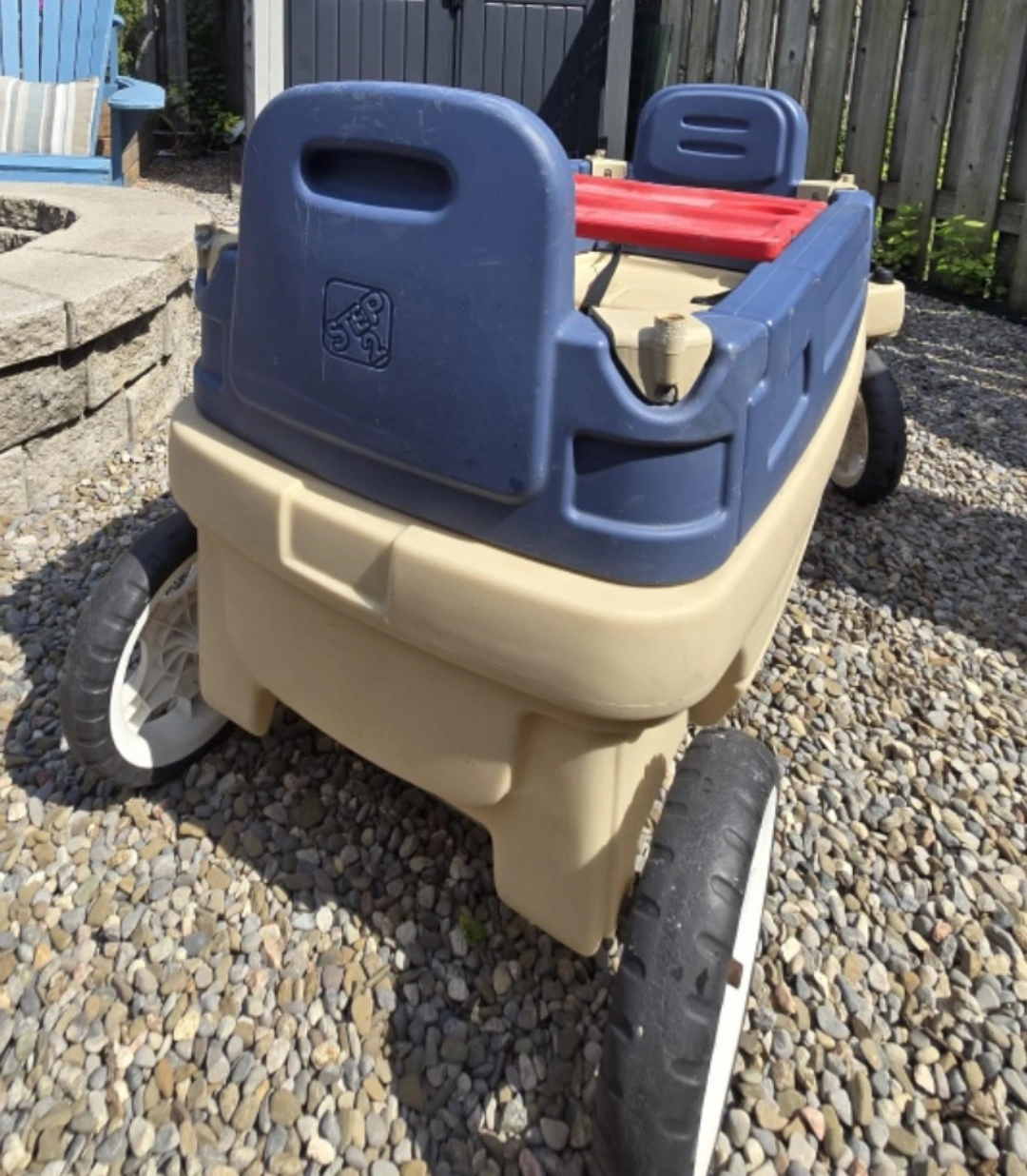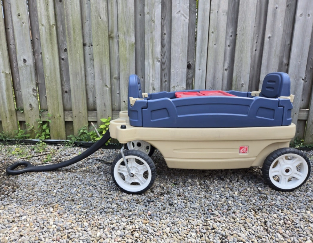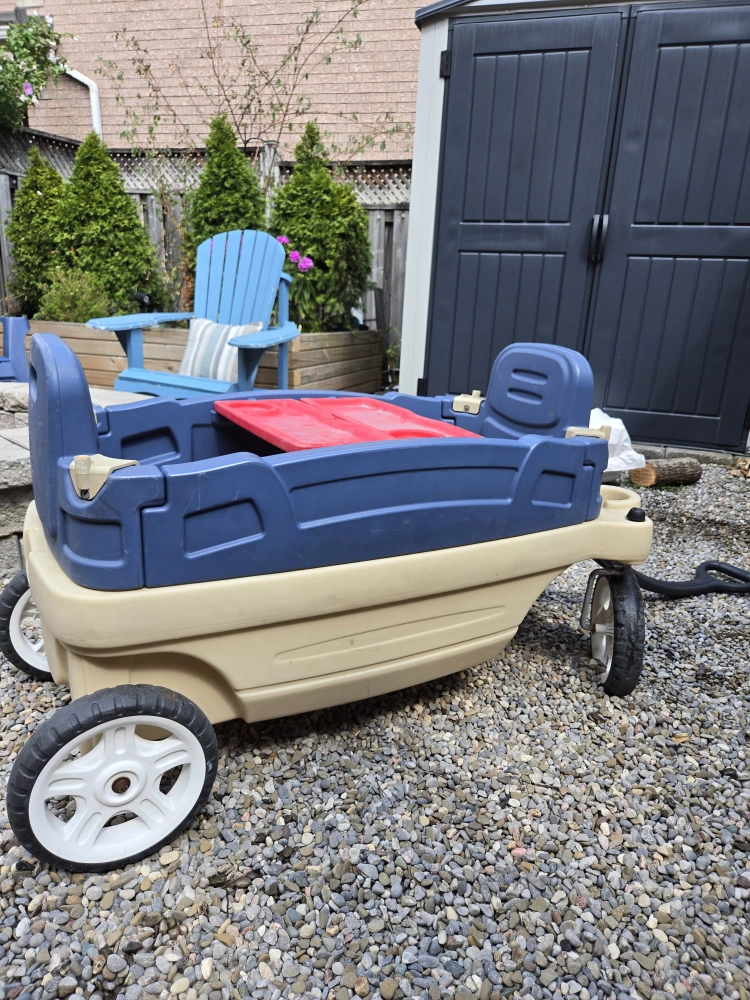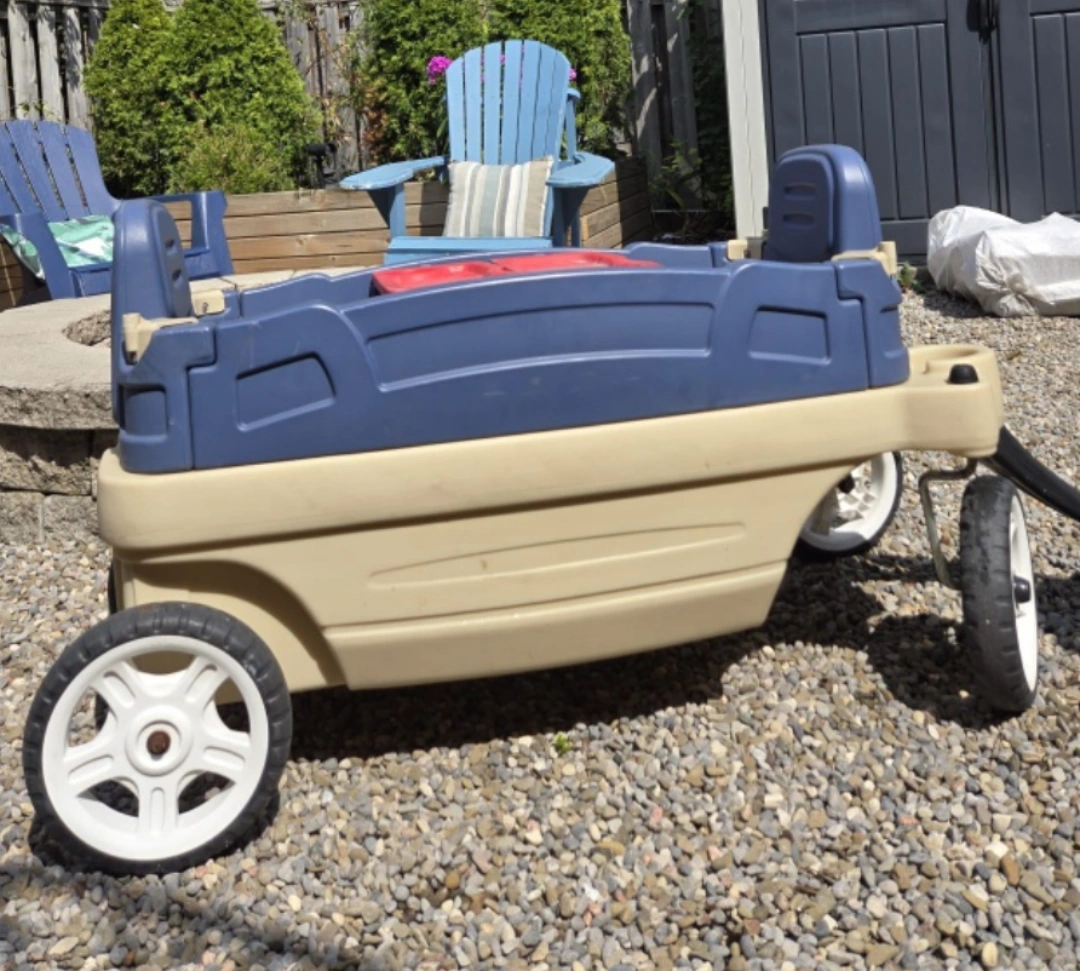 98Selling a Step2 Wagon for Two! It's in good condition and ready for new adventures. Perfect for taking the little ones around the park or neighbourhood. The wagon features a blue and tan colour scheme with a red tray inside. It also has seatbelts for safety and a handle for easy pulling