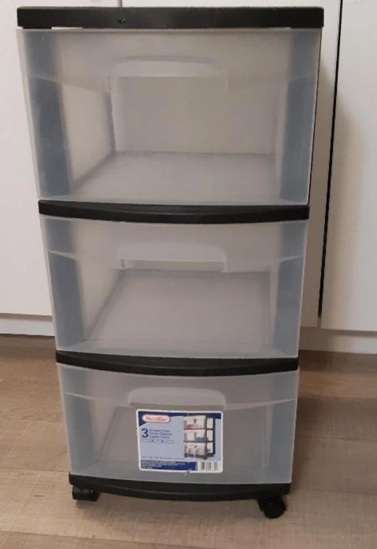 966Looking to organize your space? This Sterilite 3-drawer rolling bin cart is perfect for closet organization or any room in your home! It features a black frame with clear drawers so you can easily see what's inside. The cart is on wheels, making it easy to move around your space as needed. Dimensions are 24" H x 12.5" W x 14.5" D. All my items for sale are from a clean, pet and smoke-free home. Pickup location is at Leslie and 401/Sheppard near North York Ikea. Please check out my other postings for a bundle deals. Thanks for looking and happy shopping!