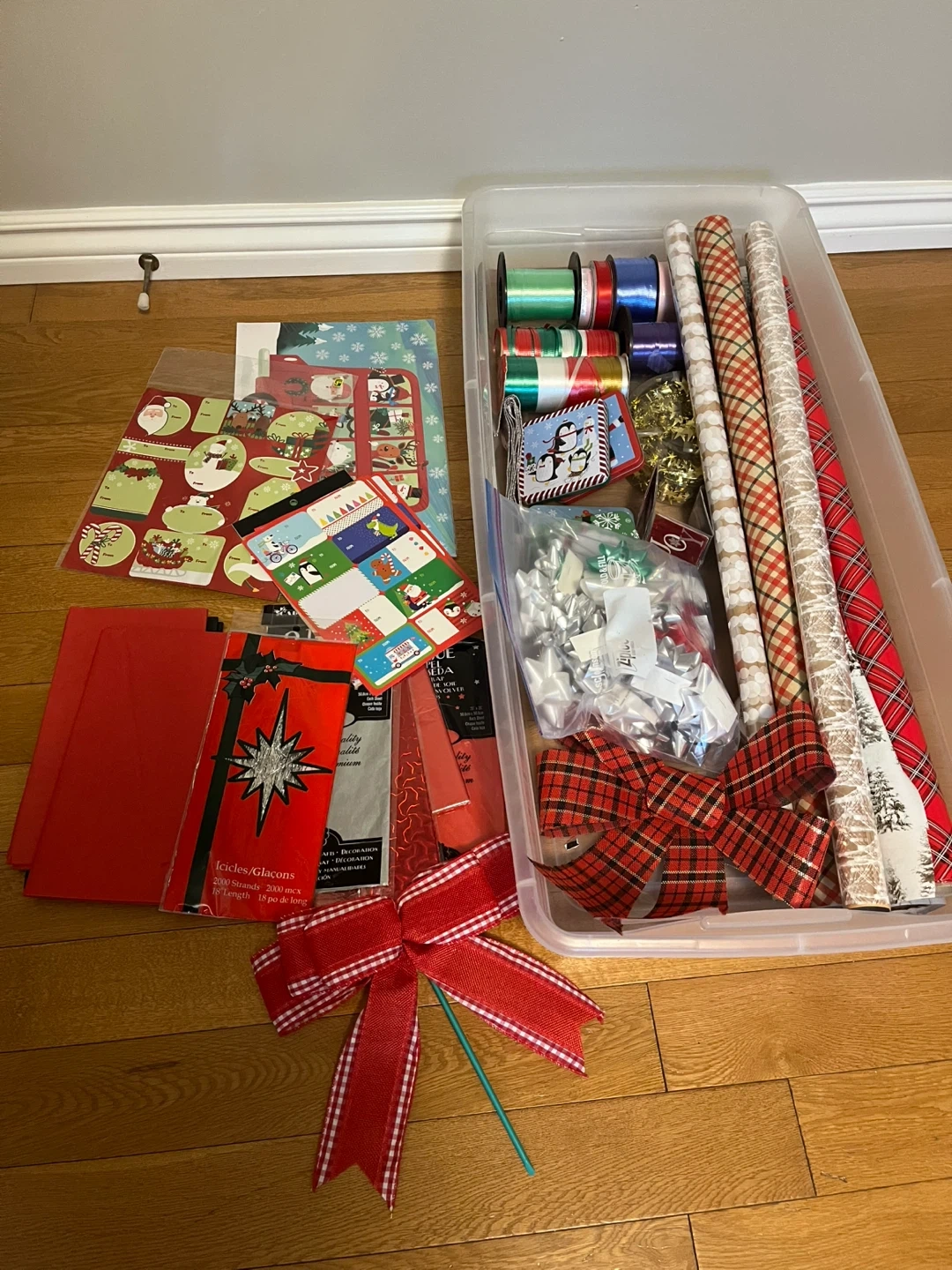 41Pick up in Utopia, price is for everything you see…..Sterilite 41 Qt. storage box filled with various Christmas supplies! The box is in great shape and comes with a lid. It's perfect for storing all your holiday decorations and wrapping paper. Get ready for the festive season with this handy storage.
