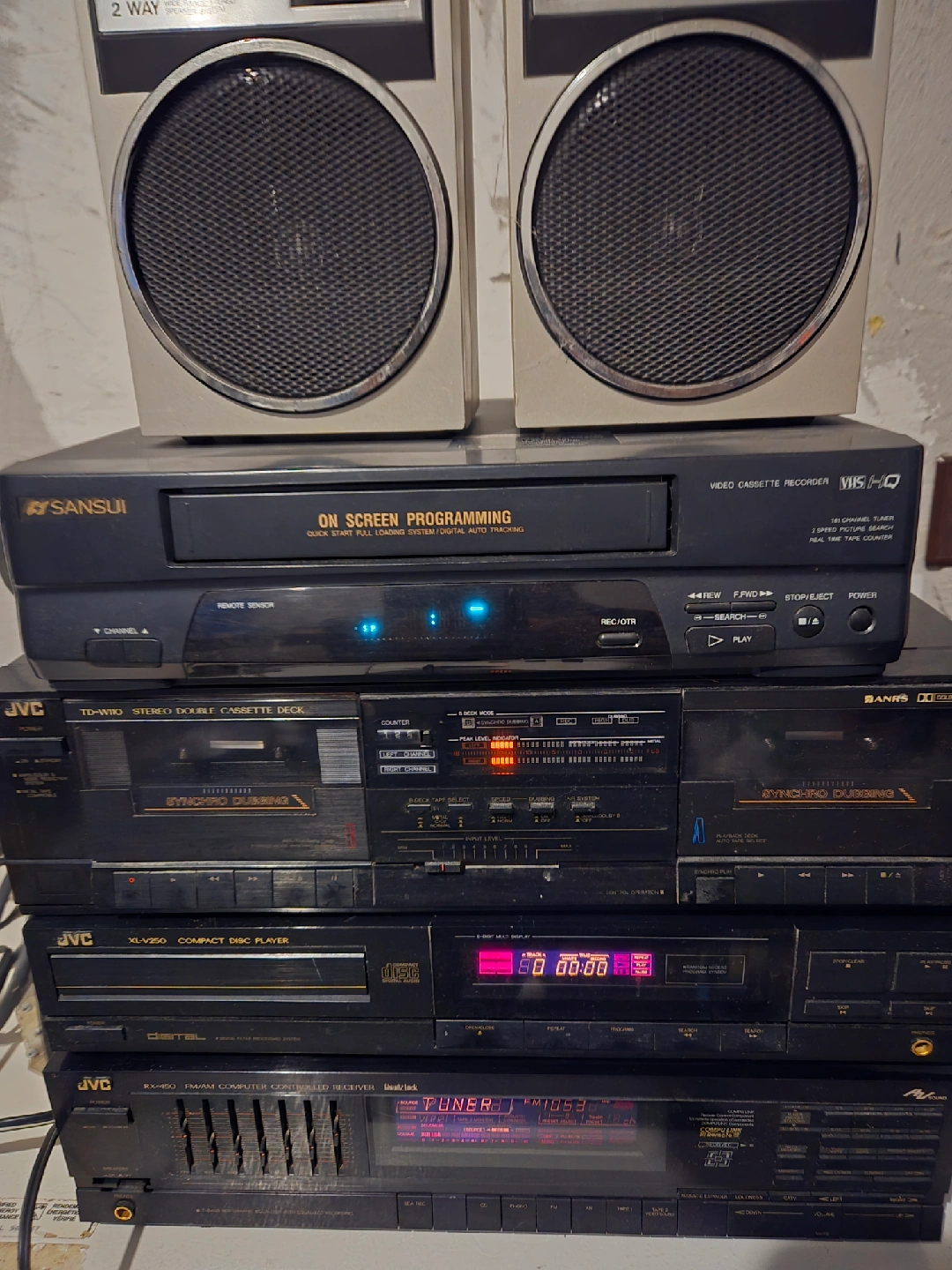 JVC Amp. with built in radio and equiliter. JVC Cassette Player. Two Speakers. Three Cassette Cases with over 100 popular cassettes. A free JVC DVD Player with a stuck door. A free Sansui VCR with no remote. And a metal power bar. $120 or best offer for everything.