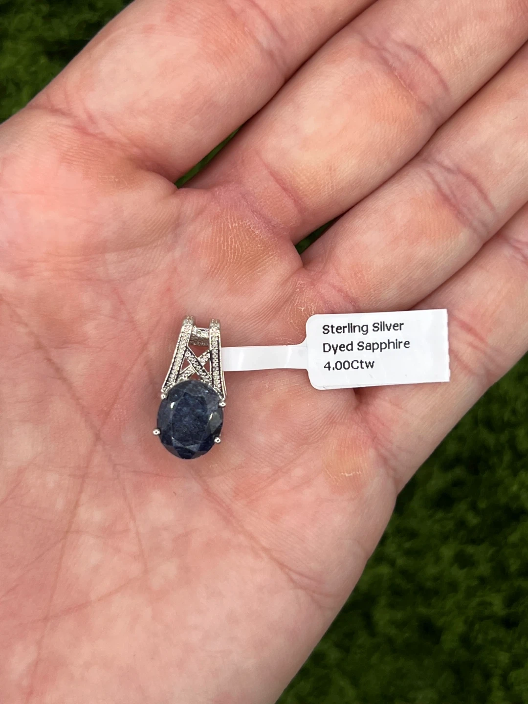Selling a beautiful sterling silver pendant featuring a dyed sapphire stone. The stone is 4.00 carats in weight. This pendant is a lovely piece to add to any jewelry collection!