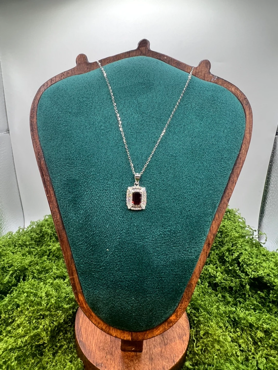 A lovely necklace featuring a red garnet. The pendant has a square shape and is surrounded by clear stones. The chain is silver in colour. It's in great condition and ready to wear! It is a unisex item and can be dressed up or down!
