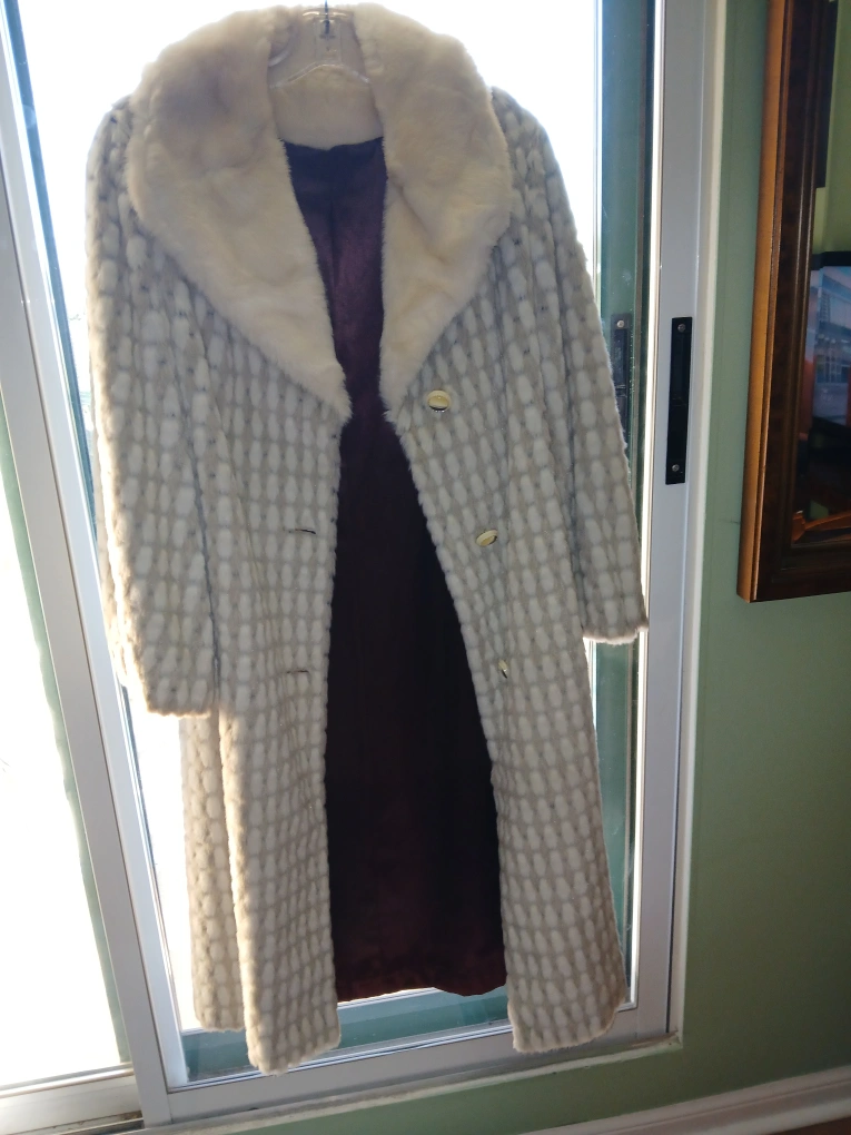 10Selling a cozy faux fur coat from Sterling Stall! It's a beautiful cream and white colour with a soft, plush feel. The lining is a lovely satin-like material in a deep burgundy colour. Perfect for adding a touch of vintage glamour to your wardrobe!