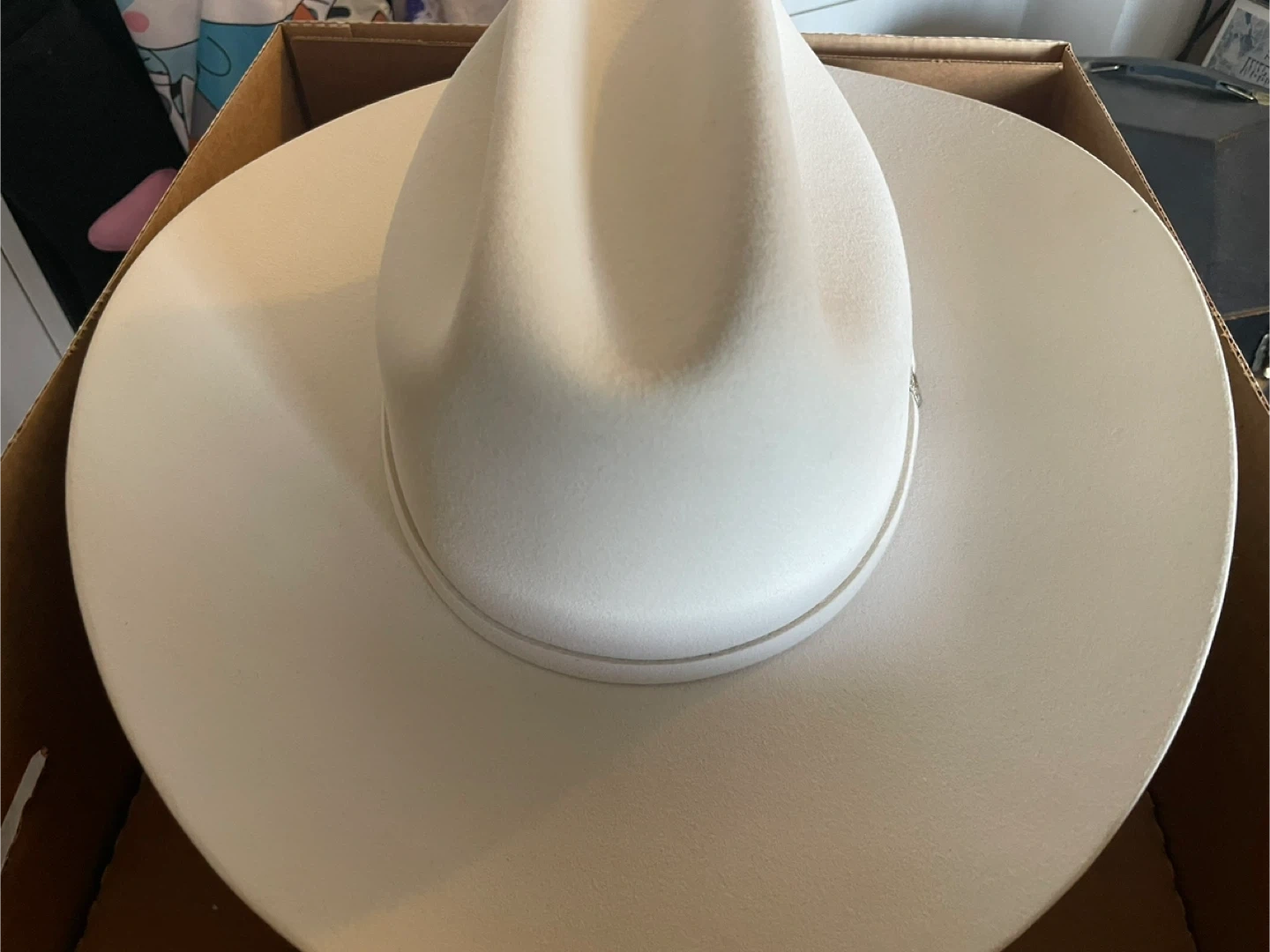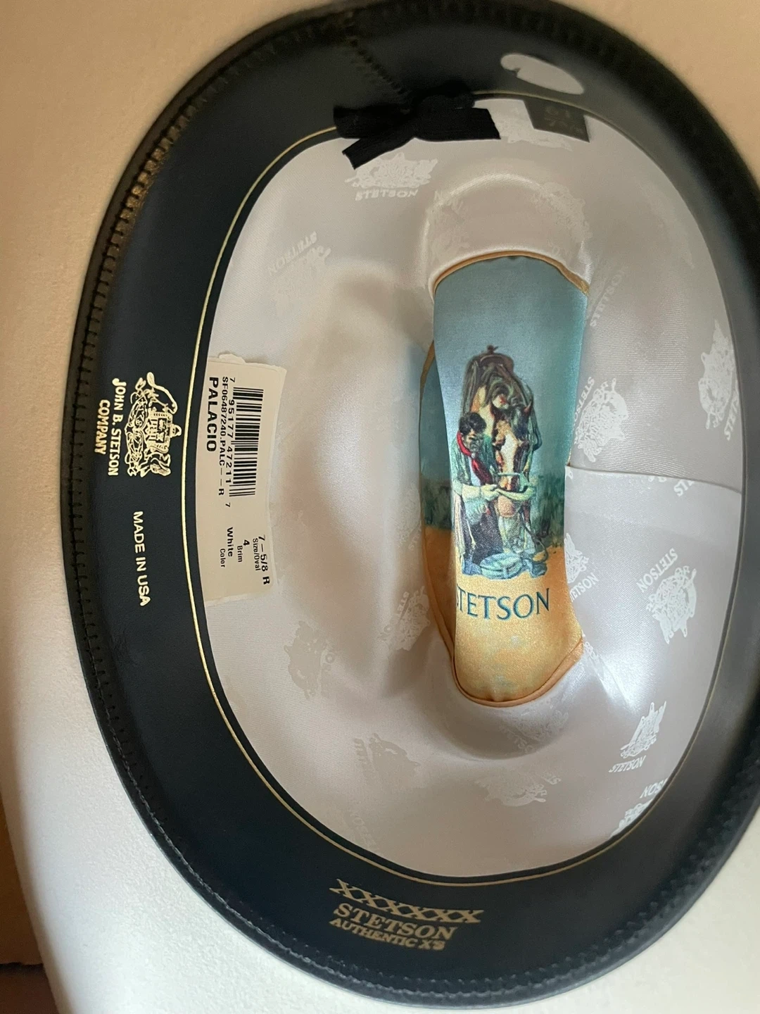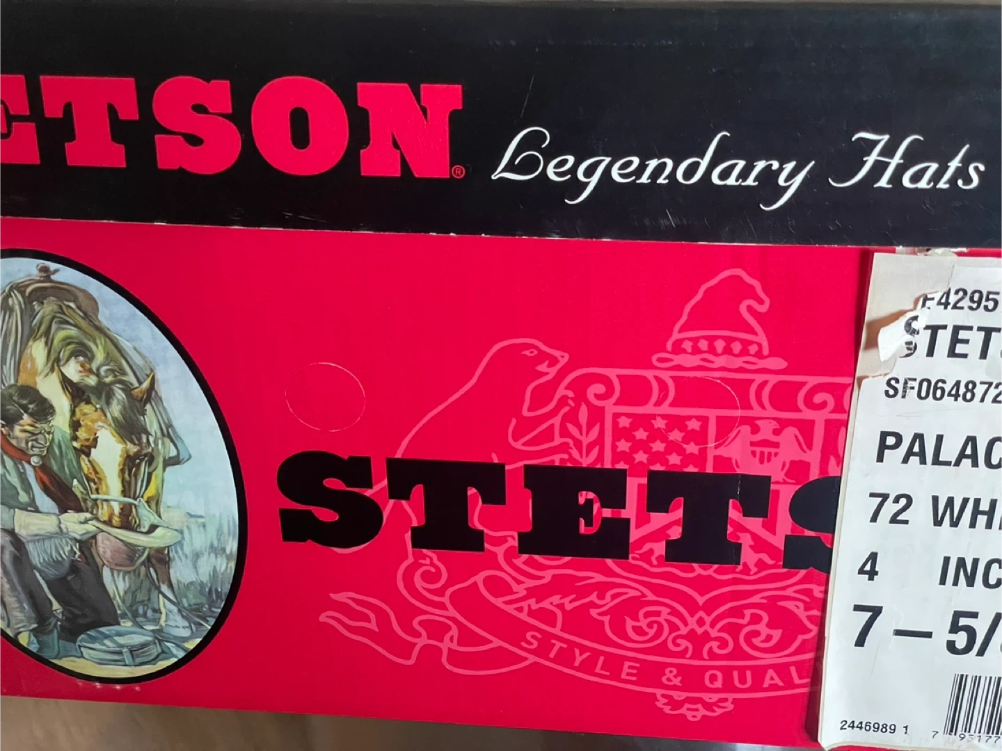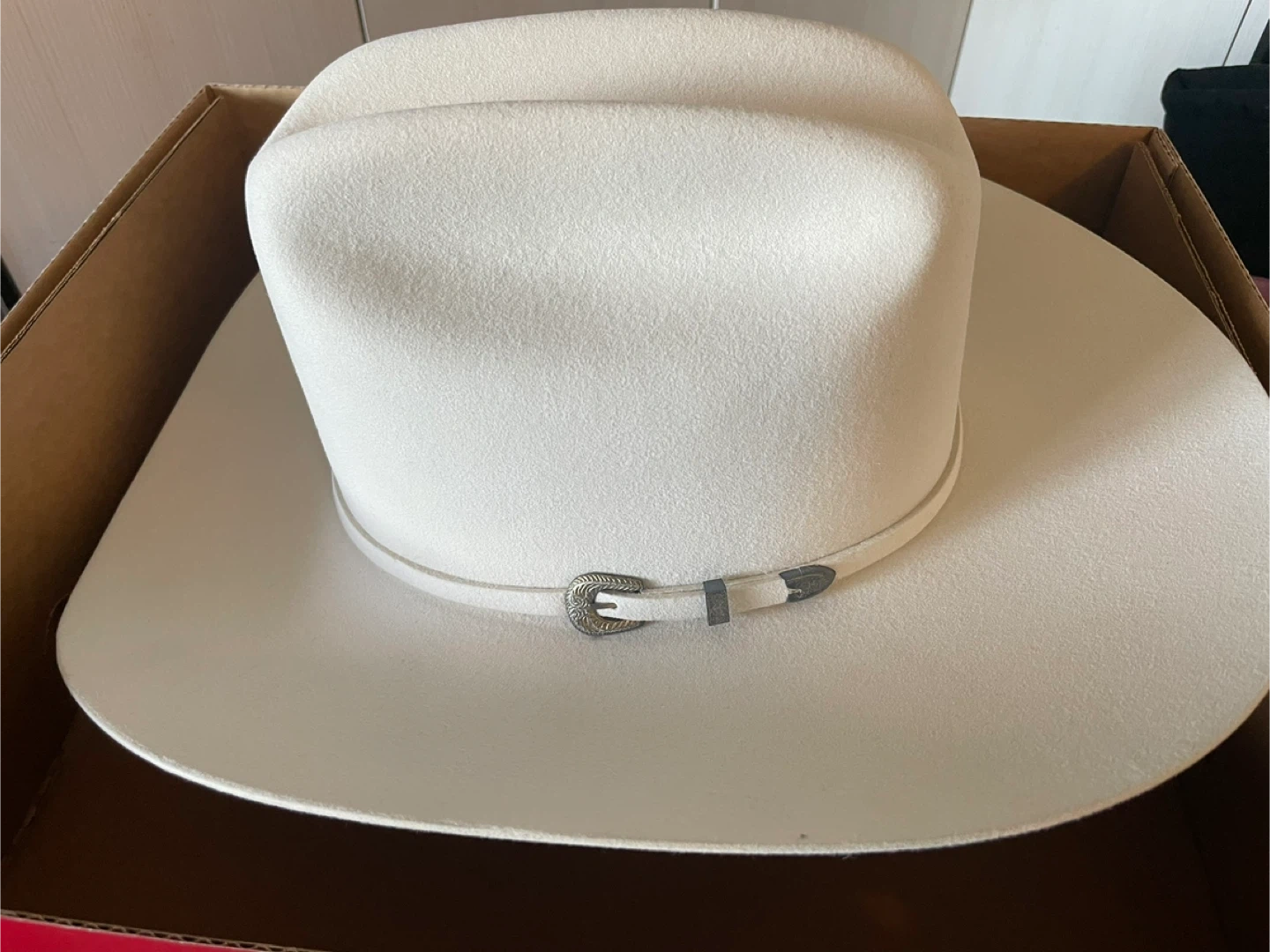 Selling a Stetson Palacio cowboy hat in white. It's a size 7 5/8. The hat comes with its original box, so it will be easy to store or transport. A classic look for any cowboy or cowgirl!