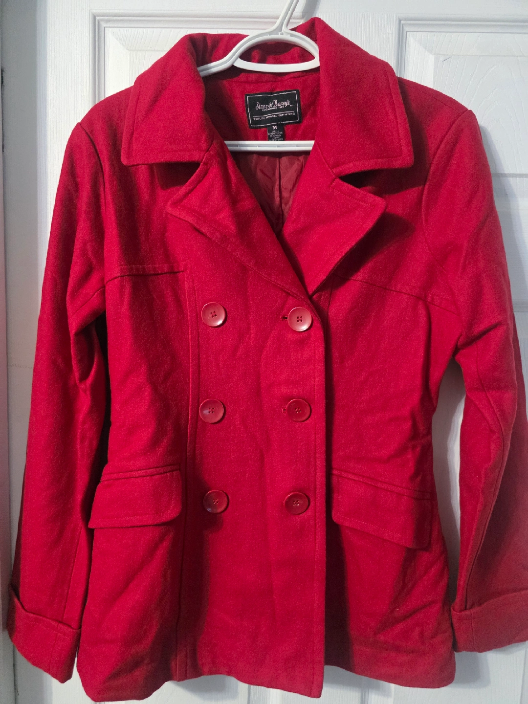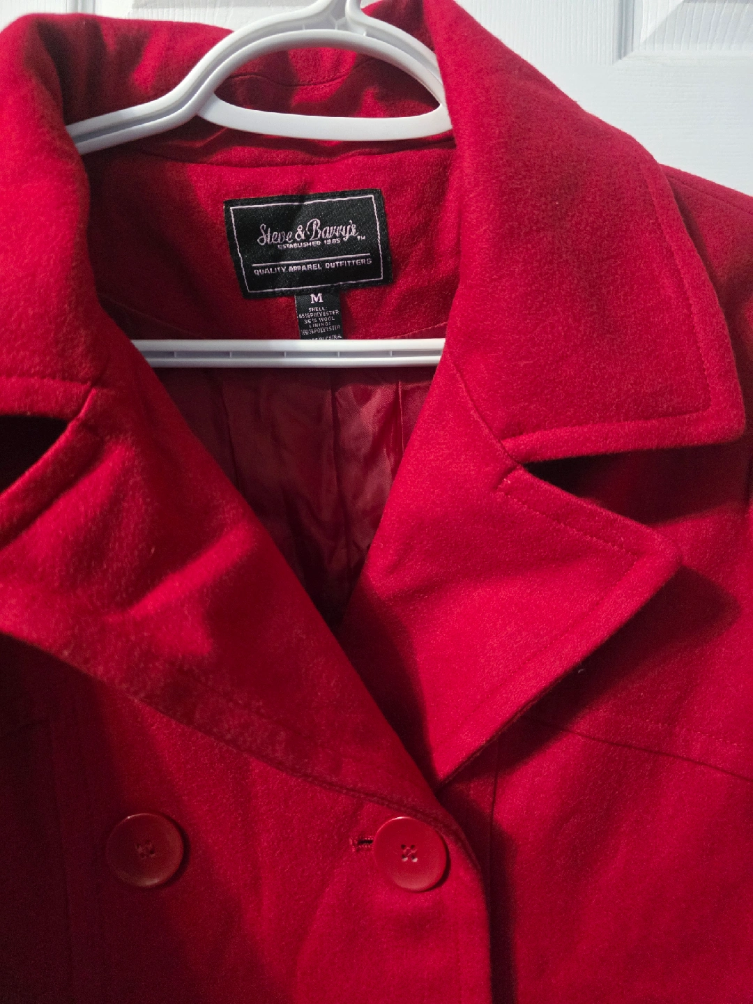 41A lovely red pea coat from Steve & Barry's! It's a size medium and made from a wool blend, perfect for adding a pop of colour to your winter wardrobe. The double-breasted style is super classic and flattering, and it's in great condition. gently used.