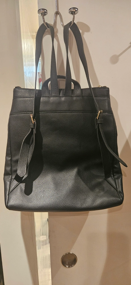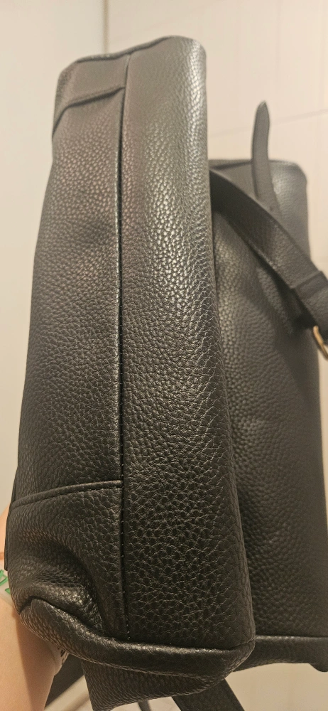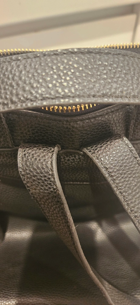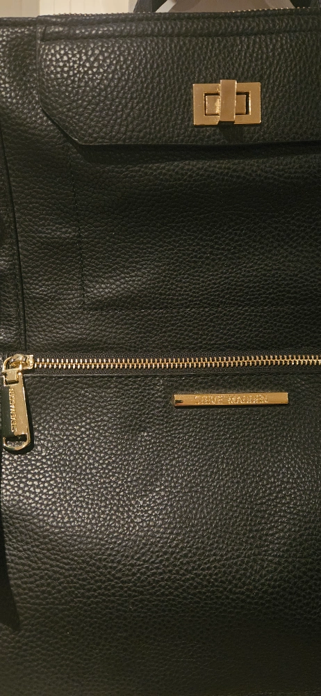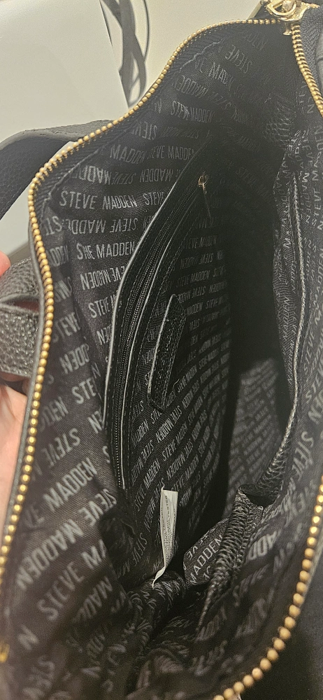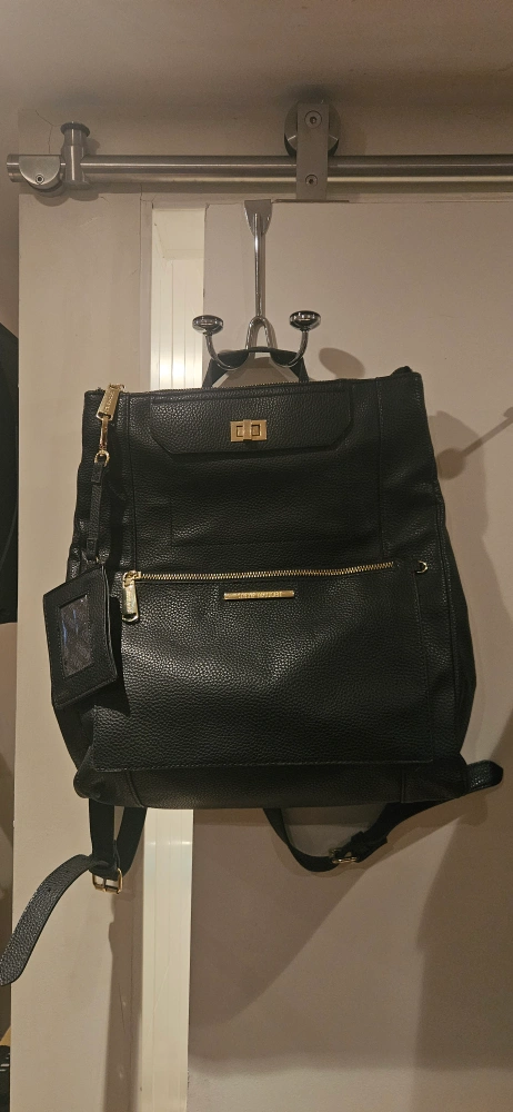 255purchased new, and barely used. excellent condition. Steve Madden pebbled leather look (100% polyester) with gold accents. Adjustable straps, 1 main zipper with 2 front pouches as well as card case. pickup in Little Italy:)