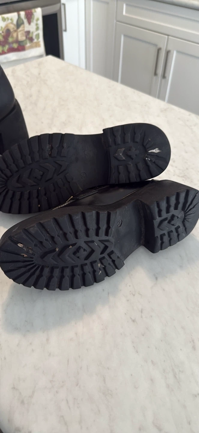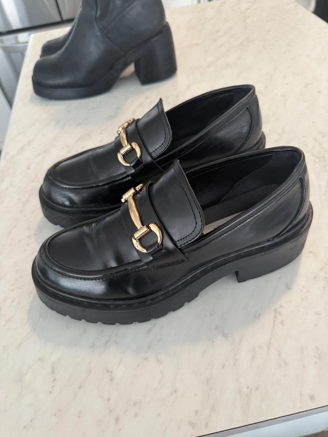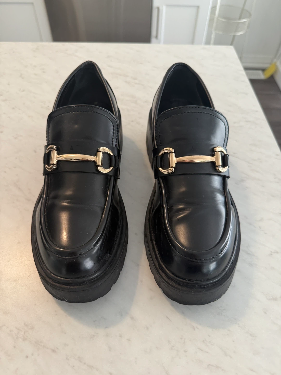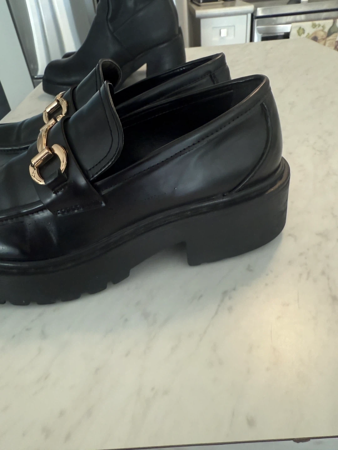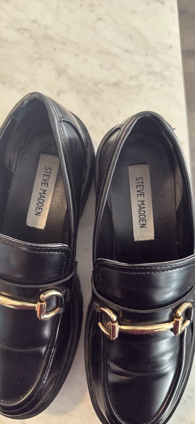 10Selling a pair of Steve Madden black loafers in size 9. They have a chunky sole and a gold-tone buckle detail. The shoes are in great condition!