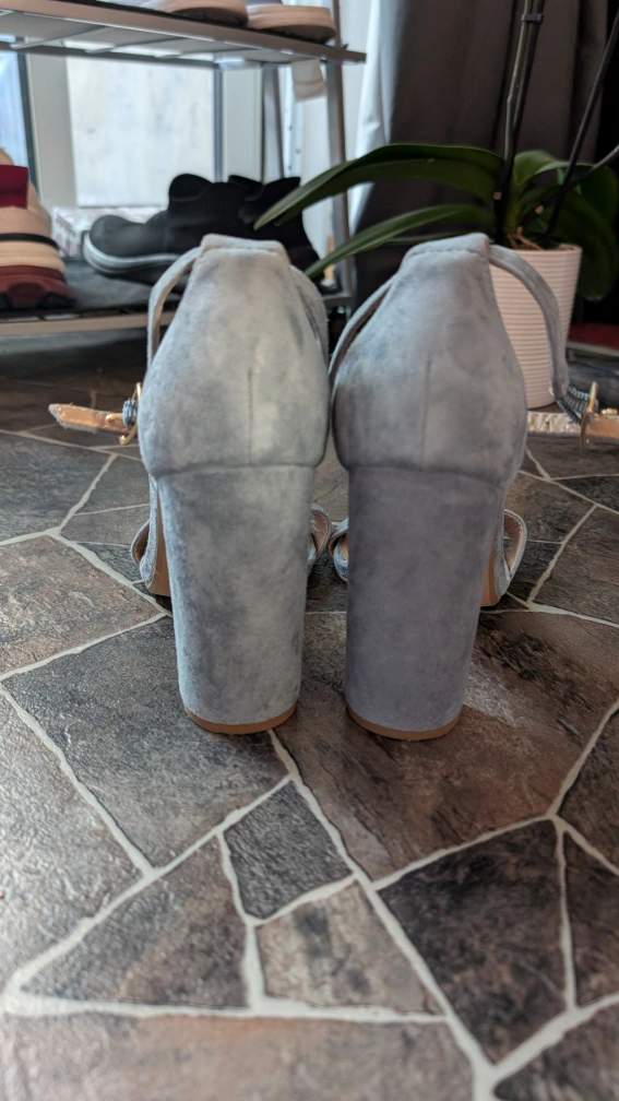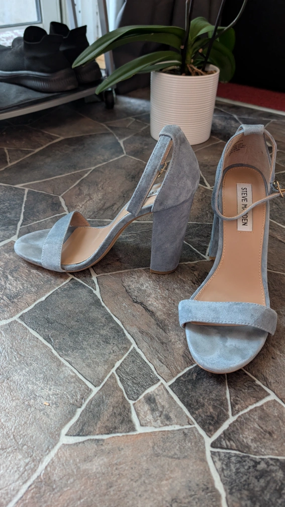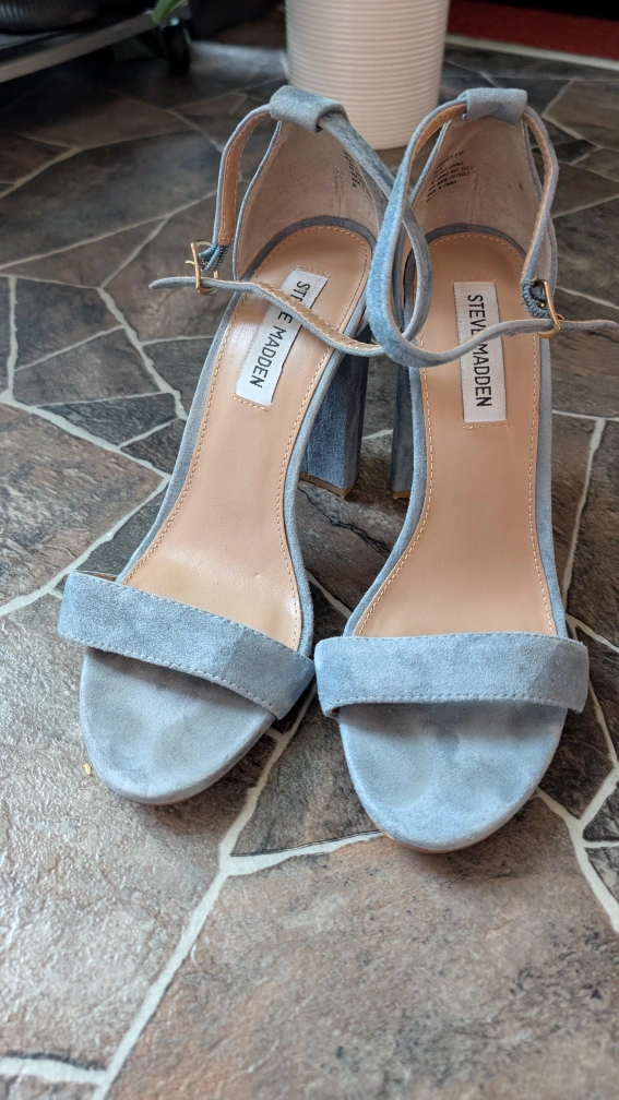 33Beautiful dusty blue suede heels. Ankle strap closure. Block heel. Great for a night out.