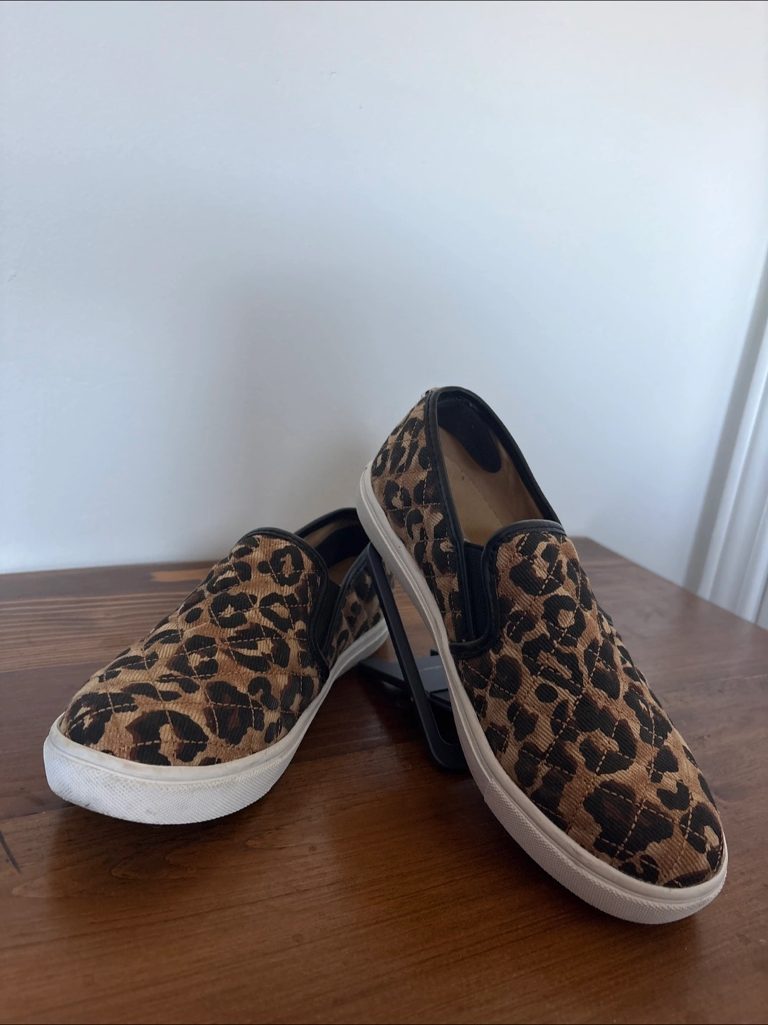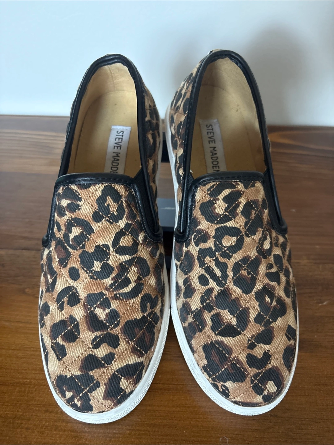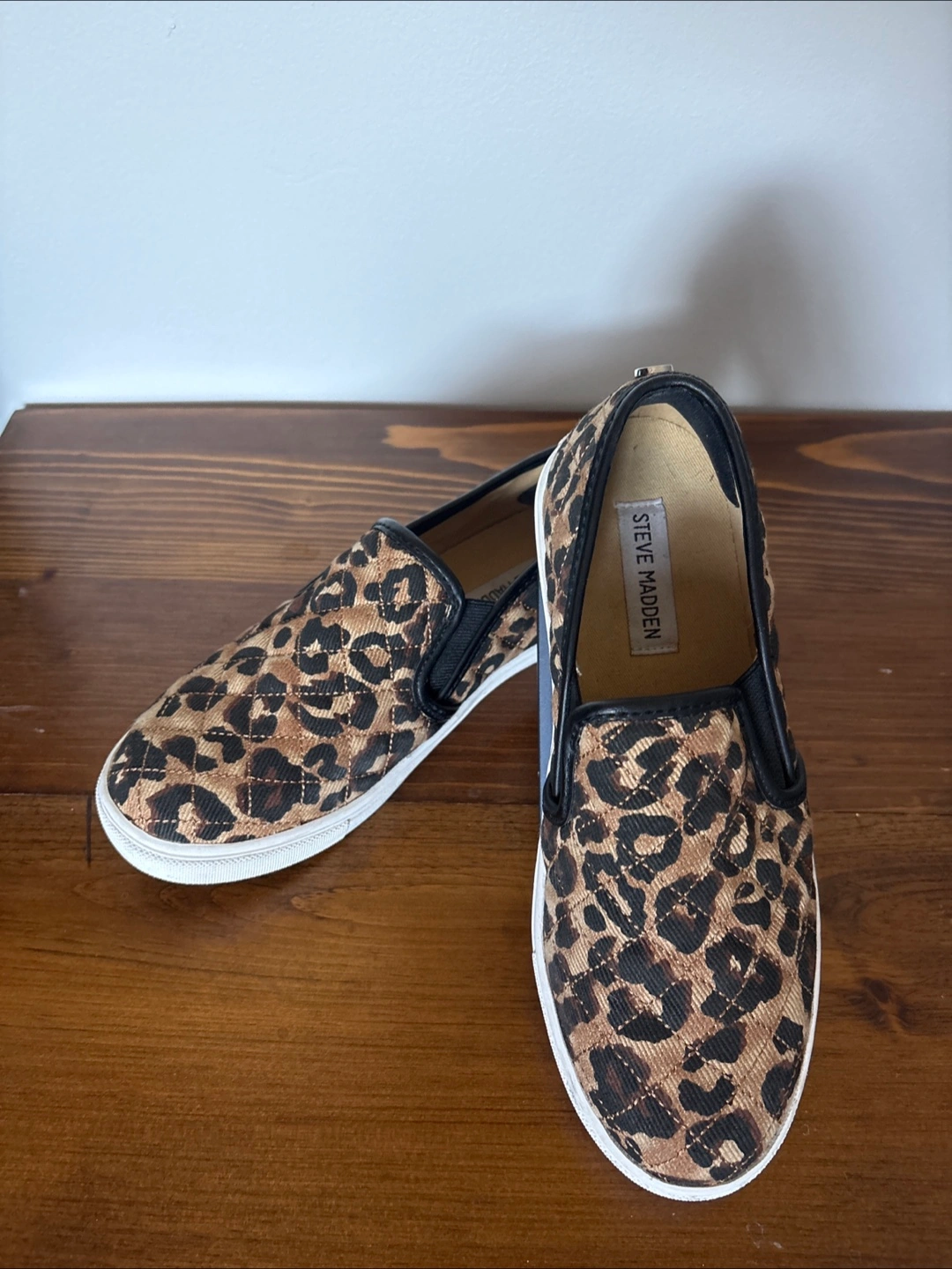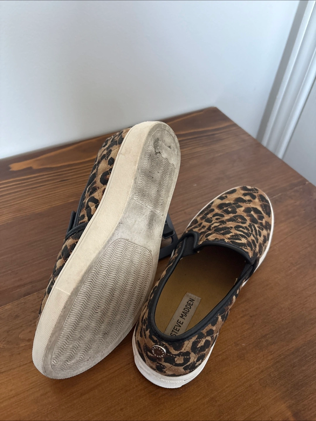 Selling a pair of Steve Madden slip-on sneakers in a fun leopard print! They're super comfy and easy to wear. These are perfect for adding a bit of flair to your everyday outfits. They show some signs of wear, as shown in the photos.