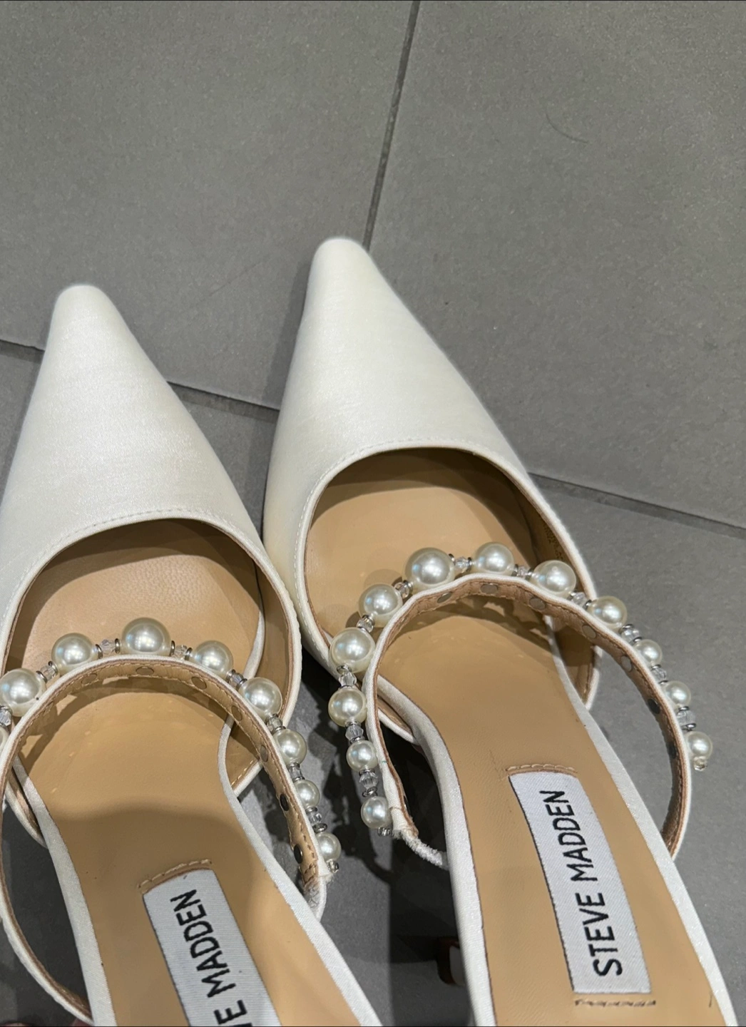 Selling a pair of Steve Madden white heels in size 8. They're in great condition and feature a stylish pearl embellishment. Perfect for a special occasion or to dress up any outfit!