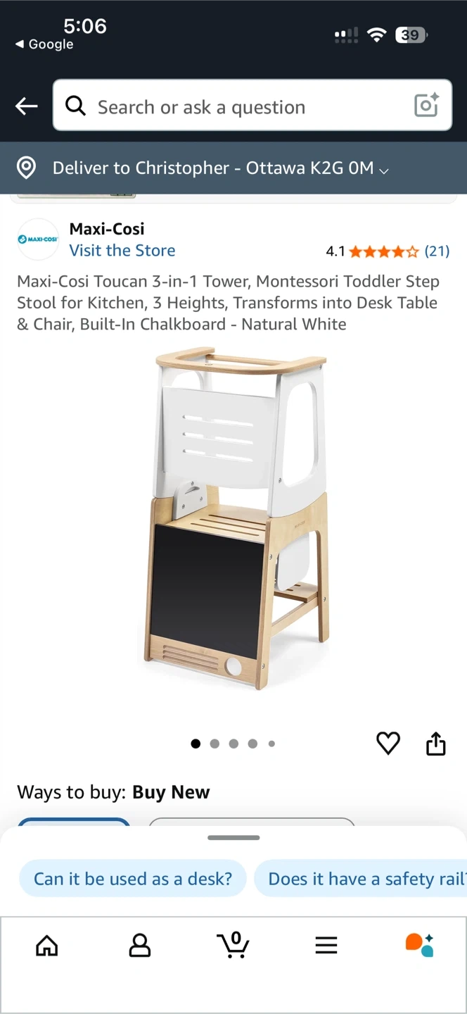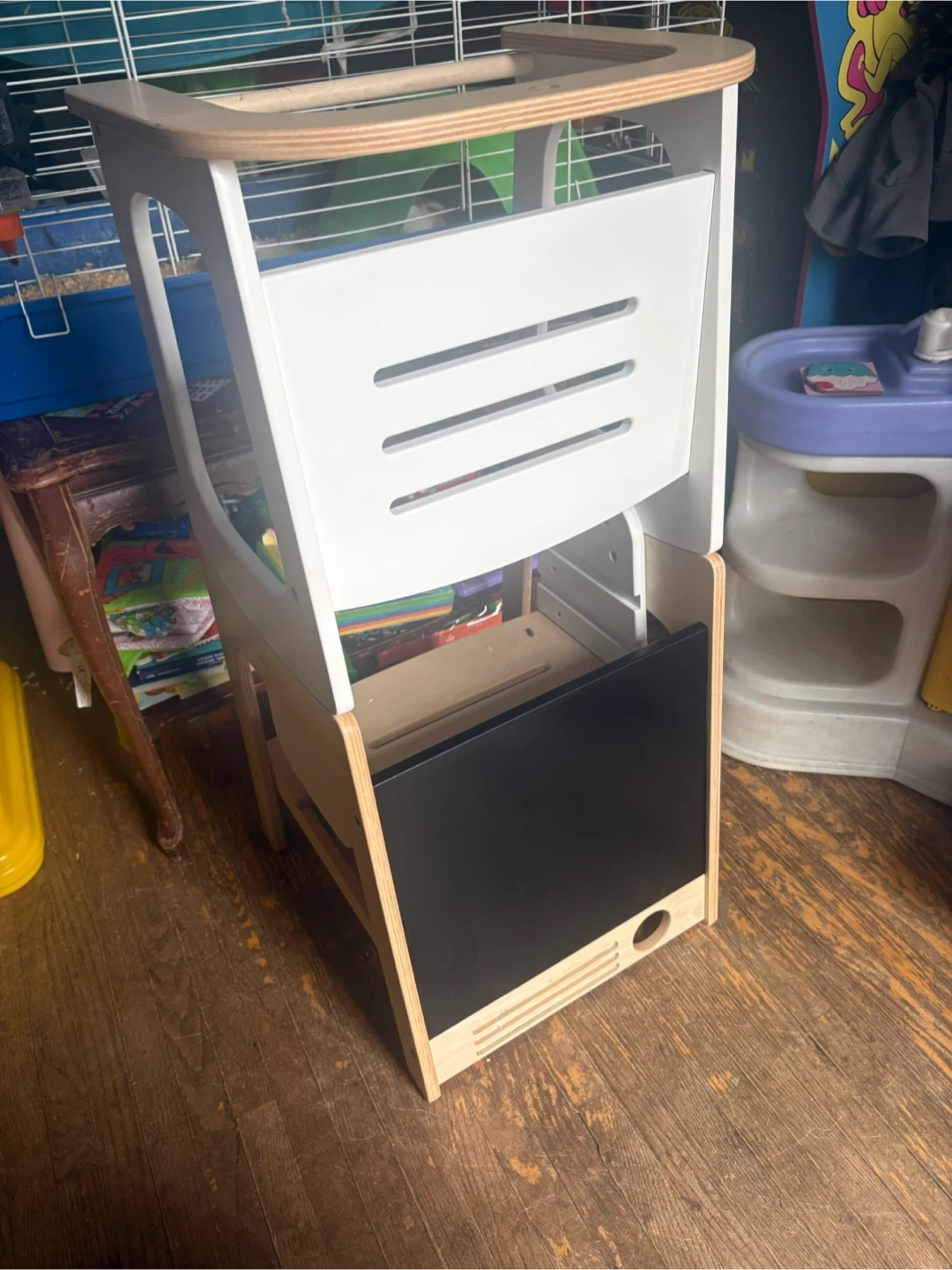This Maxi-Cosi Toucan learning tower is designed for toddlers. It transforms into a desk and chair and features a built-in chalkboard. It's made with natural wood and white accents. This is a great item to help your little one join in kitchen activities!