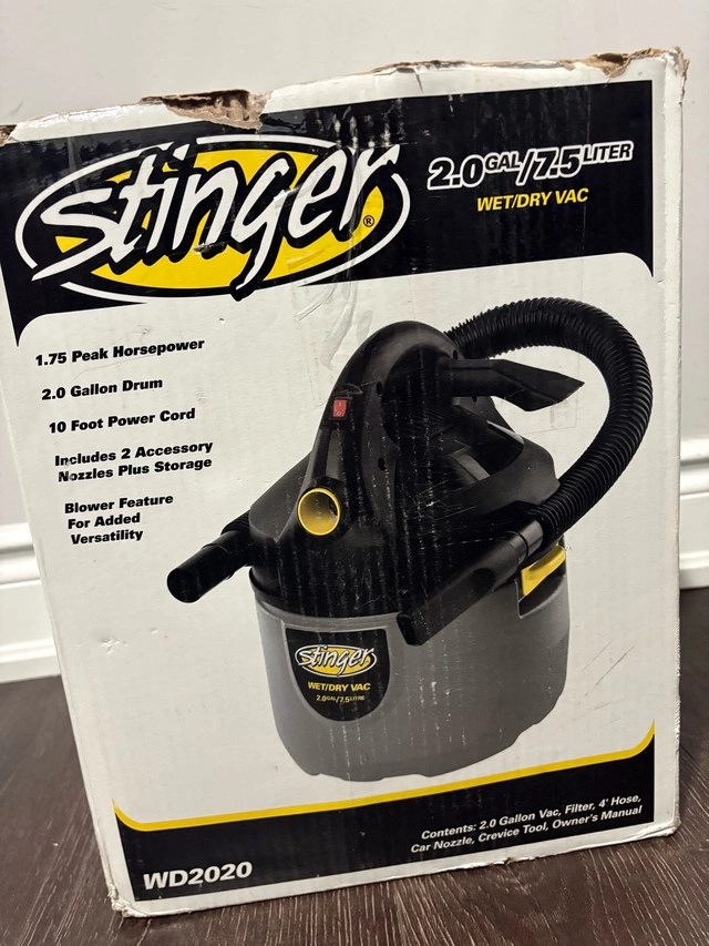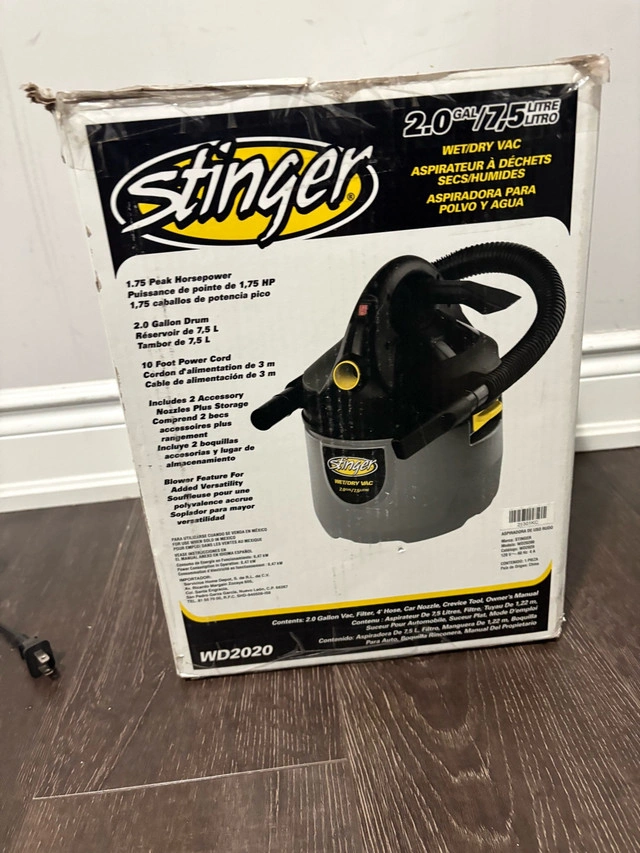15I'm selling a Stinger 2.0 Gallon Wet/Dry Vac. It features a 1.75 peak horsepower motor, a 2.0 gallon drum, and a 10-foot power cord. It includes 2 accessory nozzles and a blower feature for added versatility. It is in used condition, but works great. Specifications: * 1.75 Peak Horsepower * 2.0 Gallon Drum * 10 Foot Power Cord * Includes 2 Accessory Nozzles plus storage * Blower Feature For Added Versatility I'm pricing this at $30. If the ad is up, it's available!