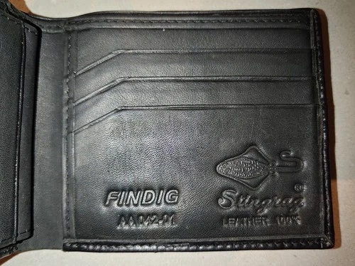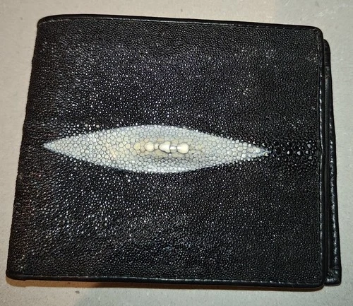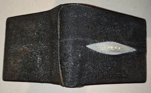 15Premium handcrafted FINDIG men’s bi-fold wallet made from genuine stingray leather, featuring the signature natural “eye” pattern at the center — a hallmark of authentic stingray hide. Features: • Exterior: 100% real stingray skin (textured, glossy finish) • Interior: Smooth full-grain leather with 6 card slots and bill compartment • Durable, water-resistant, and uniquely luminous texture • Embossed “FINDIG Stingray Leather 100%” branding inside Condition: Good pre-owned condition. Clean interior, tight stitching, mild edge wear only. Polished surface retains deep gloss and sharp definition in the natural eye pattern. A striking, exotic wallet — both functional and collectible.