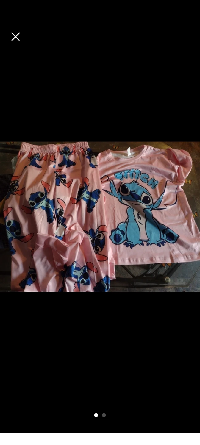 41Super cute Stitch pajama set! These are perfect for lounging around the house or for a cozy night's sleep. The set includes a short-sleeved top and matching pants, both featuring a fun Stitch design. They're in New condition and ready for a new home!